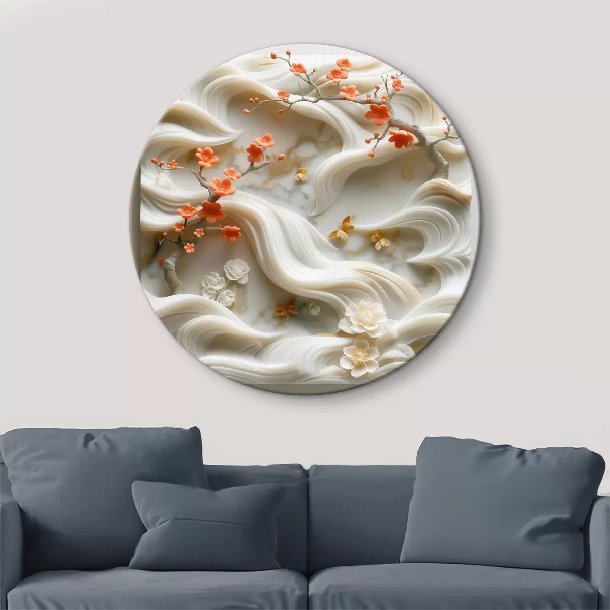 Okrągły obraz Niebiańska scena ogrodowa 3D wyrzeźbiona w płaskorzeźbie z białego marmuru z płynącą florą i fauną Nr r39730