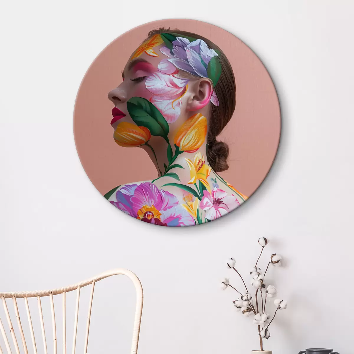Okrągły obraz Makijaż kolorowymi farbami kwiatowymi na ciele kobiety Nr r39732