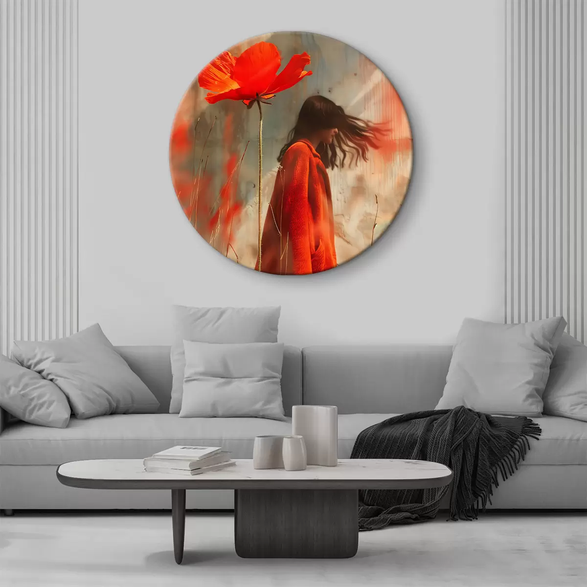 Okrągły obraz Dziewczyna w czerwonym futrze z makiem rosnącym na polu Nr r39764