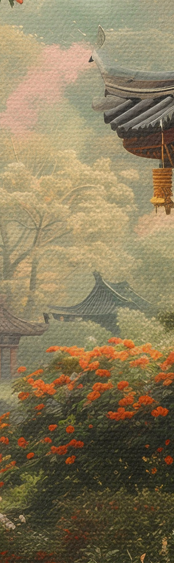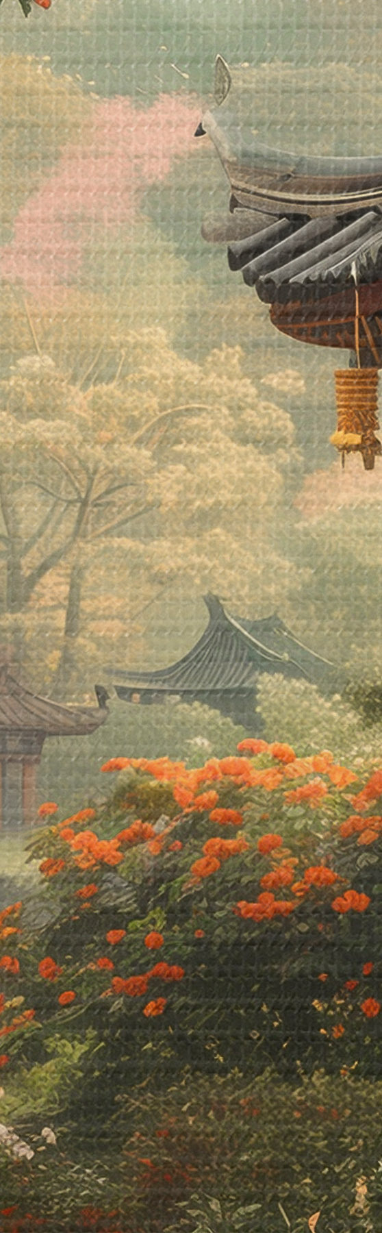 Okrągłe obrazy Japoński park z kwitnącymi drzewami i kwiatami, las, domek ogrodowy, jezioro r39772