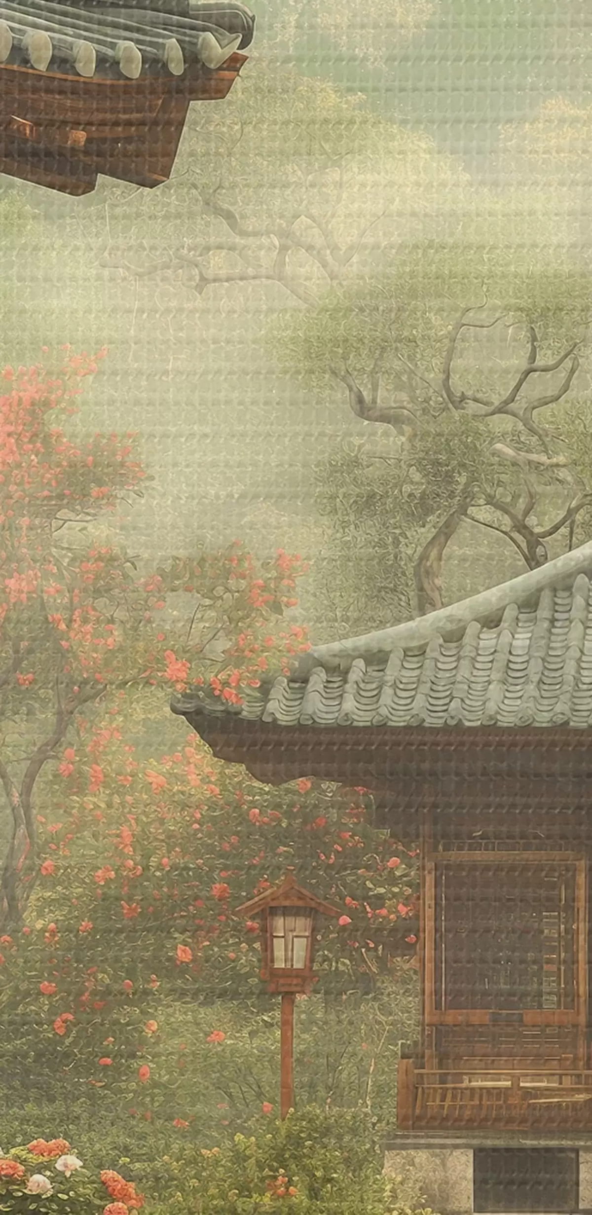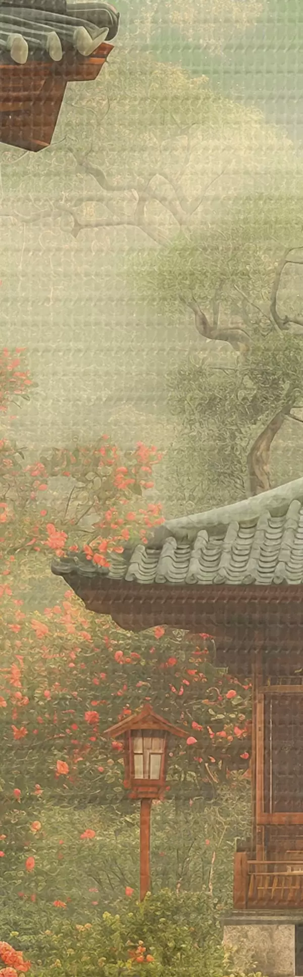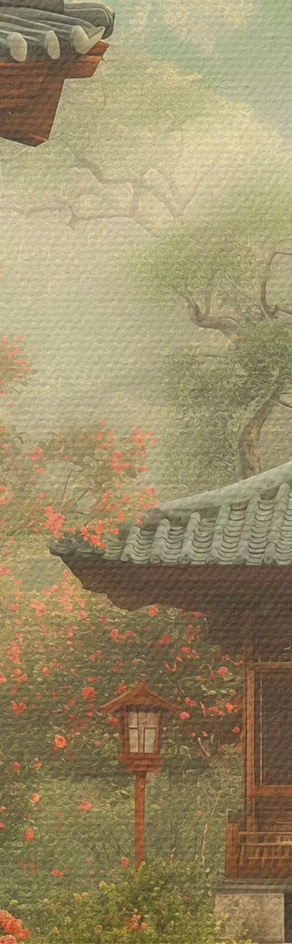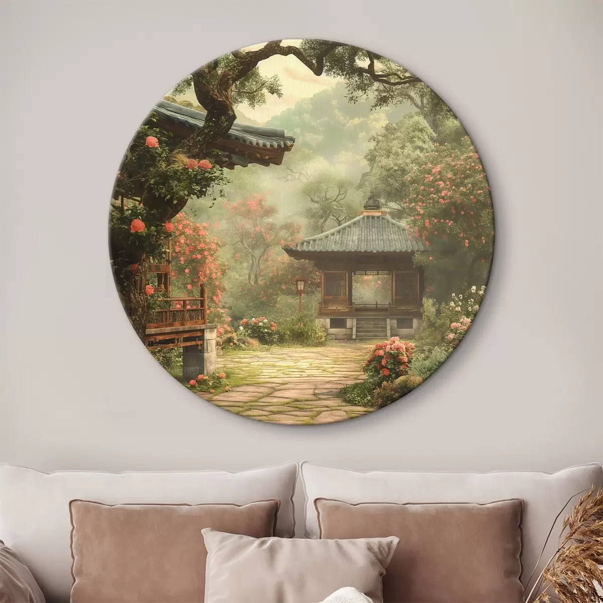 Okrągłe obrazy Japoński park z kwitnącymi drzewami i kwiatami, las, drewniany dom r39773