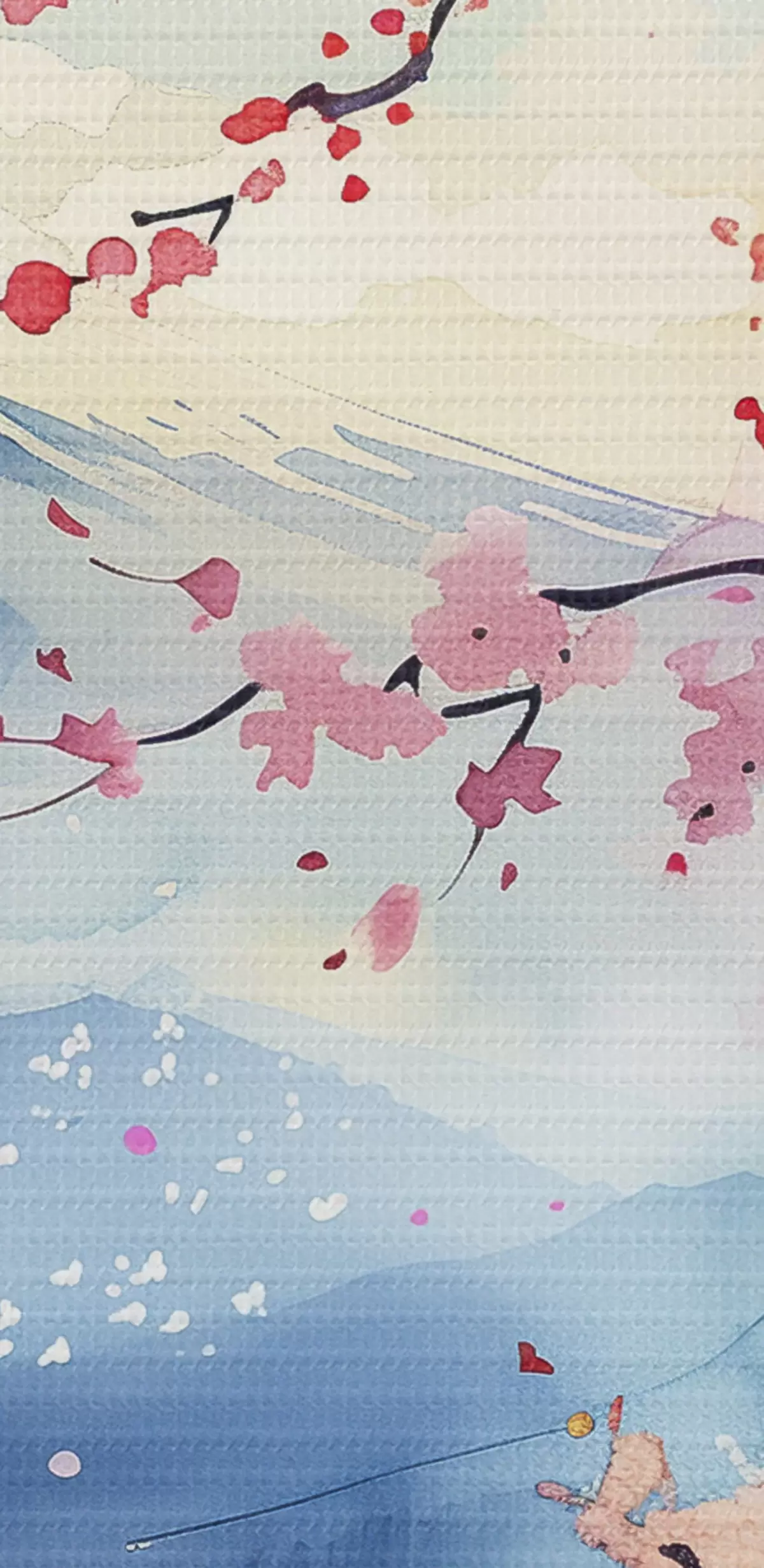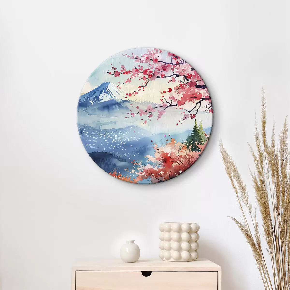Okrągłe obrazy Górski krajobraz Fuji, orientalna przyroda, wiśnie, zachód słońca r39775