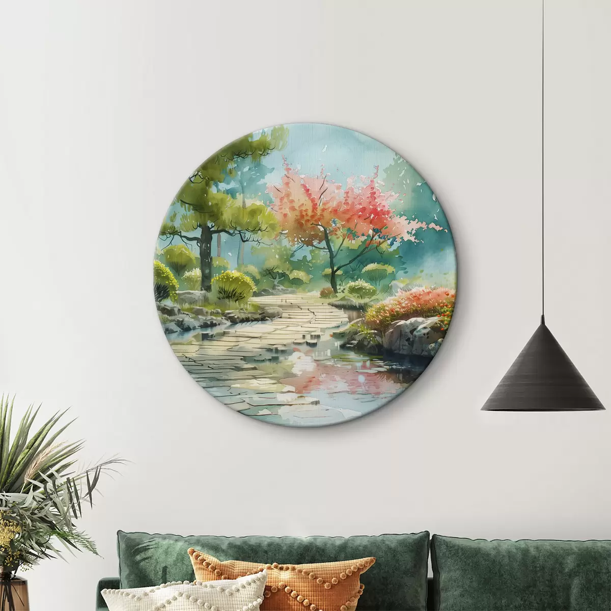 Okrągły obraz Park z drzewami i krzewami kwiatów, stawem, wiśnią Nr r39778