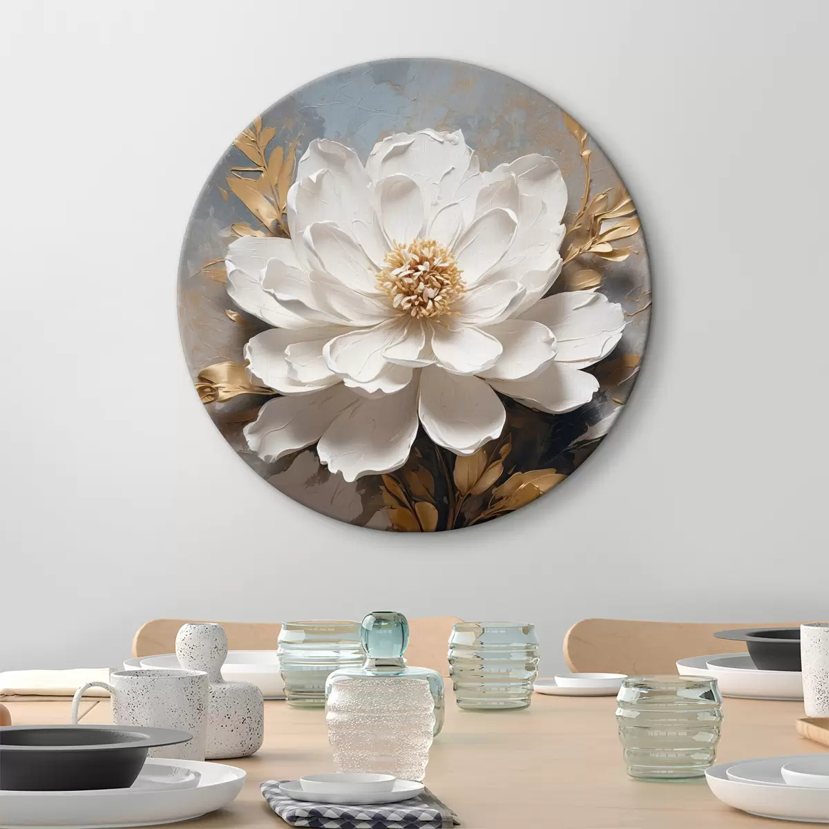 Okrągłe obrazy Biały kwiat z łodygami na abstrakcyjnym tle r39865