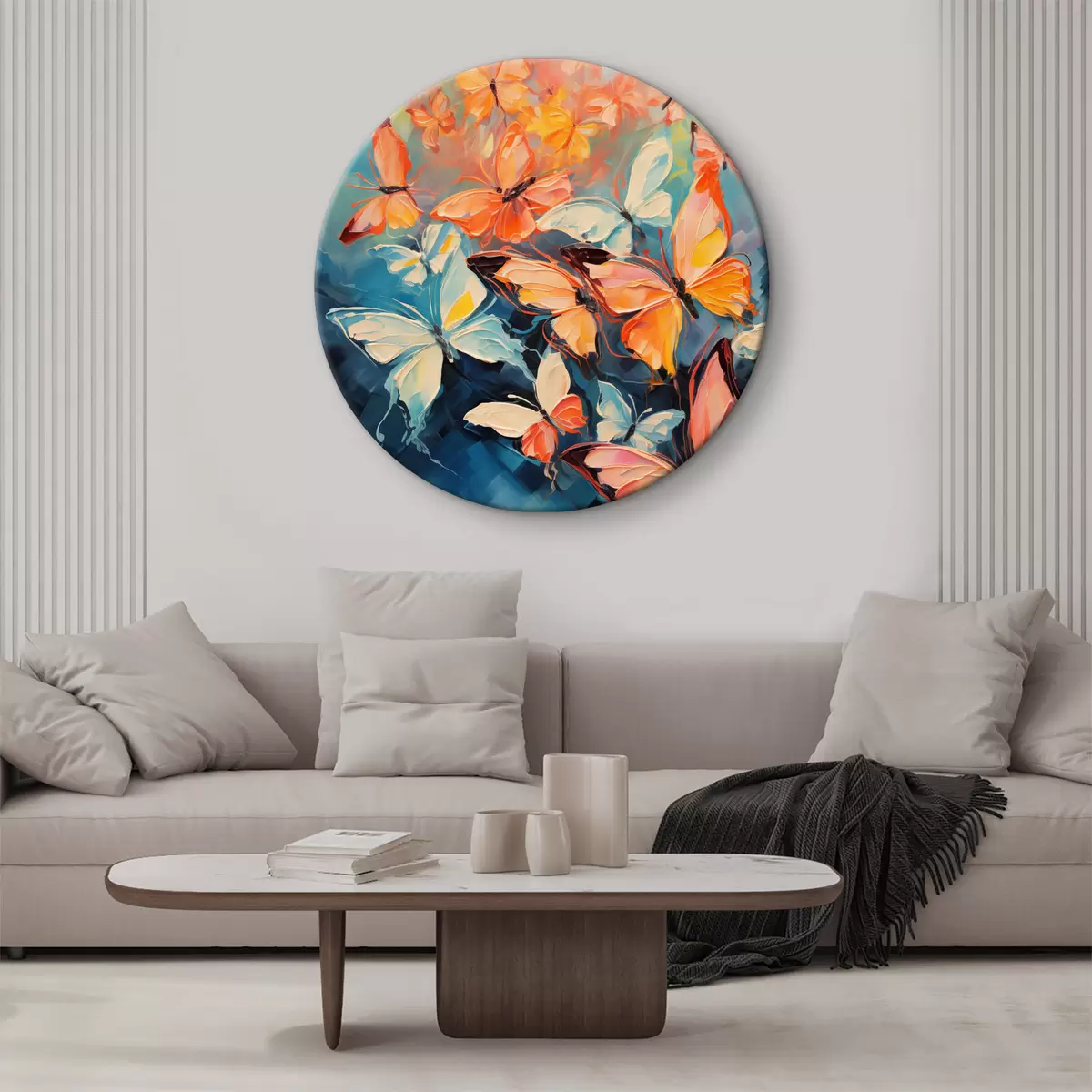 Okrągły obraz Stado motyli latające na niebieskim obrazie olejnym Nr r39922