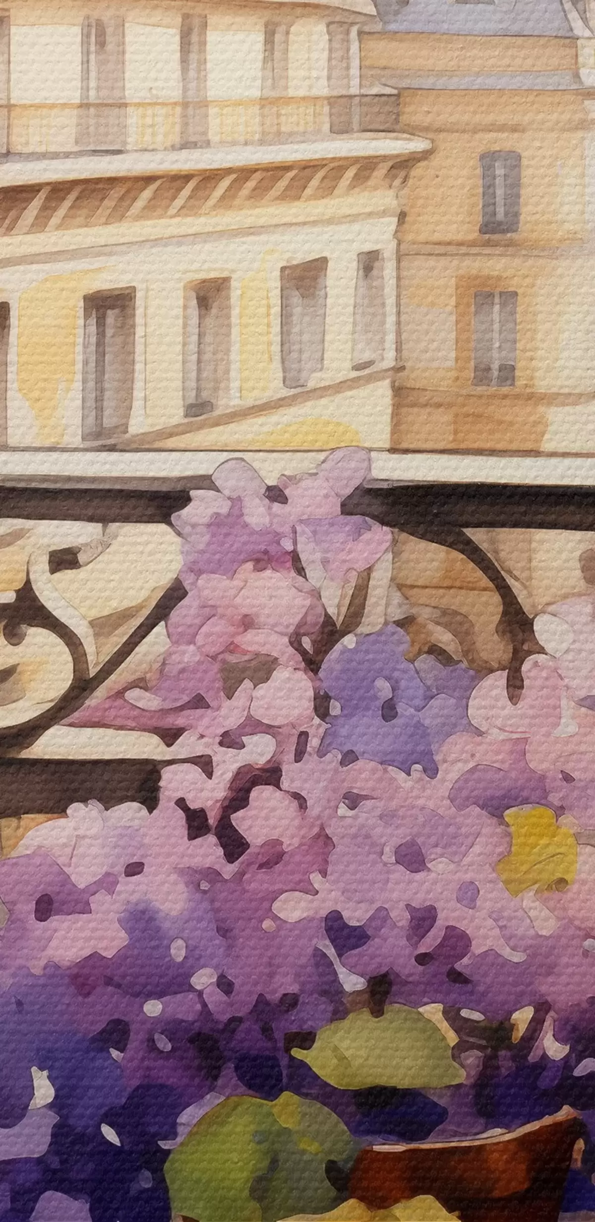 Okrągły obraz Fiołki w doniczce na balkonie w akwareli Paryża Nr r39931