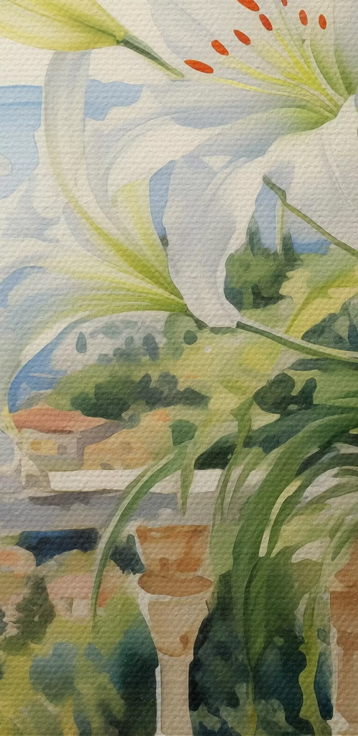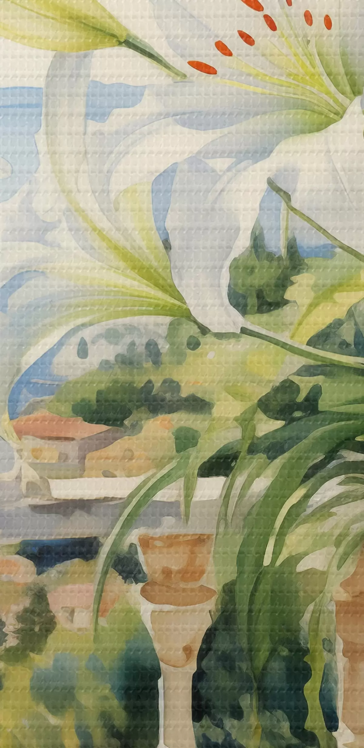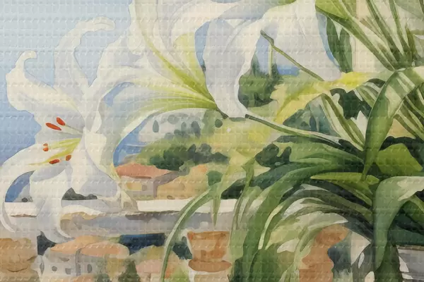 Okrągły obraz Białe lilie w doniczce na balkonie na tle zatoki akwarela Nr r39932
