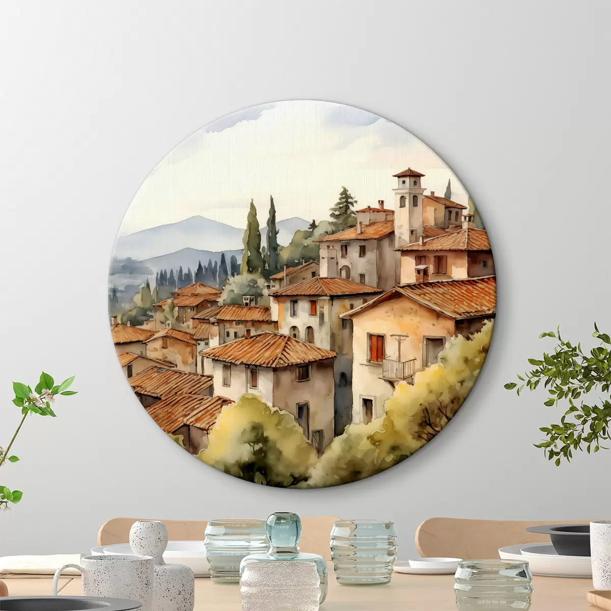 Okrągłe obrazy Domy we włoskich wioskach na tle gór, dachów, akwarela r39934