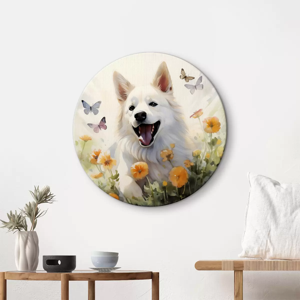 Okrągłe obrazy Biały pies siedzi w kwiatach, motyle latają akwarela r39936