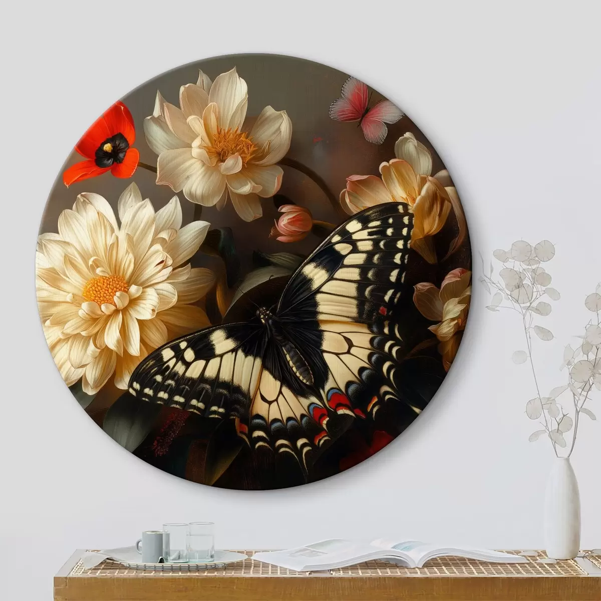 Okrągły obraz Chryzantemy, bukiet, kwiaty, tulipan, motyl Nr r39951