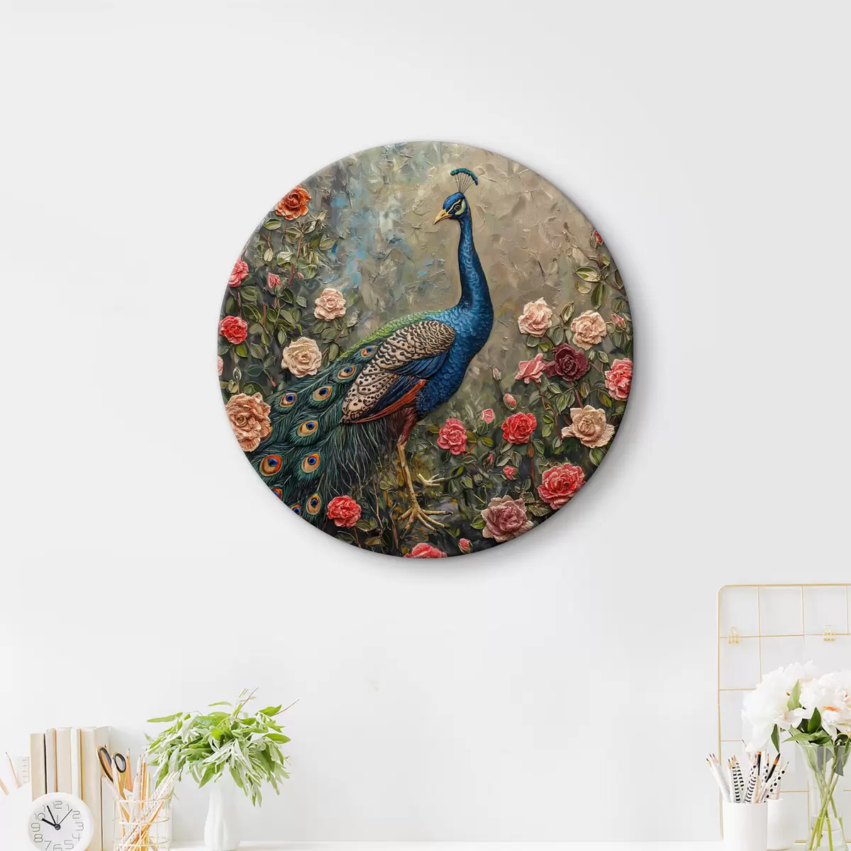 Okrągły obraz Paw, kwiaty rzemieślnicze, ogród Nr r39959