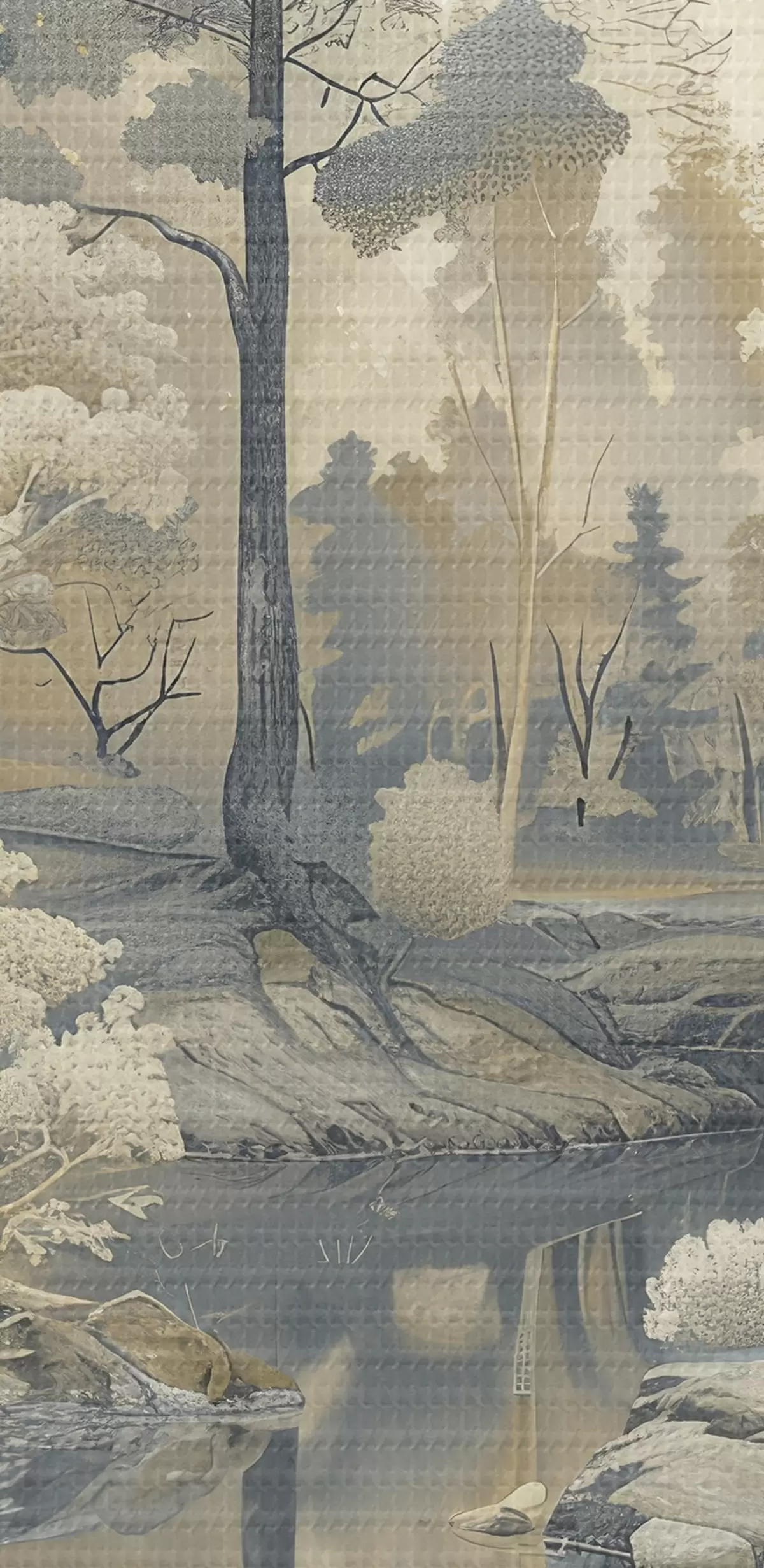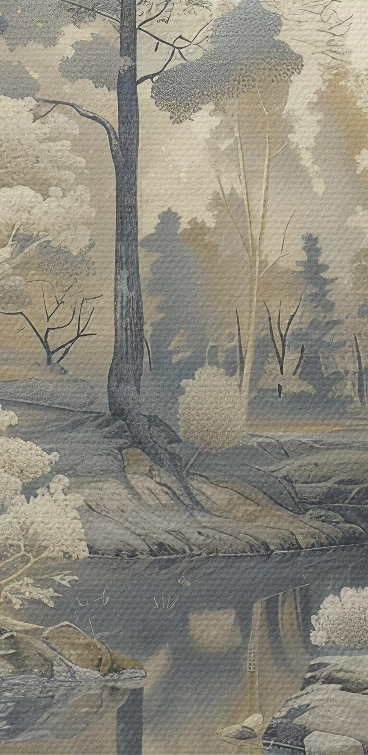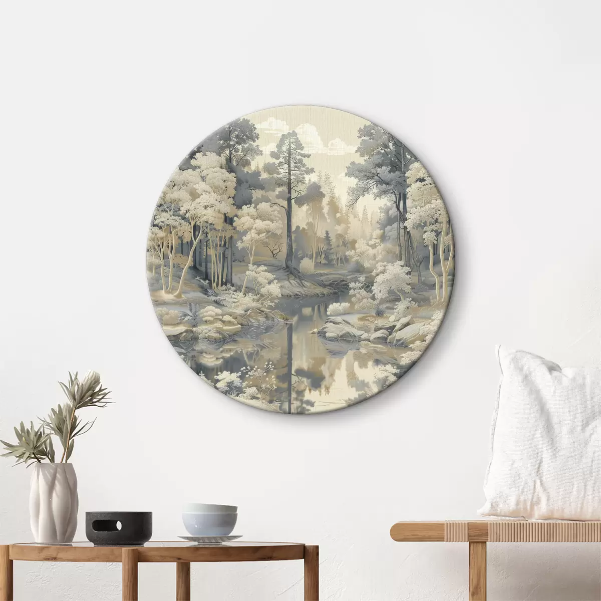 Okrągły obraz Krajobraz leśny, kolory monochromatyczne, drzewa, staw, delikatne pastele Nr r39974