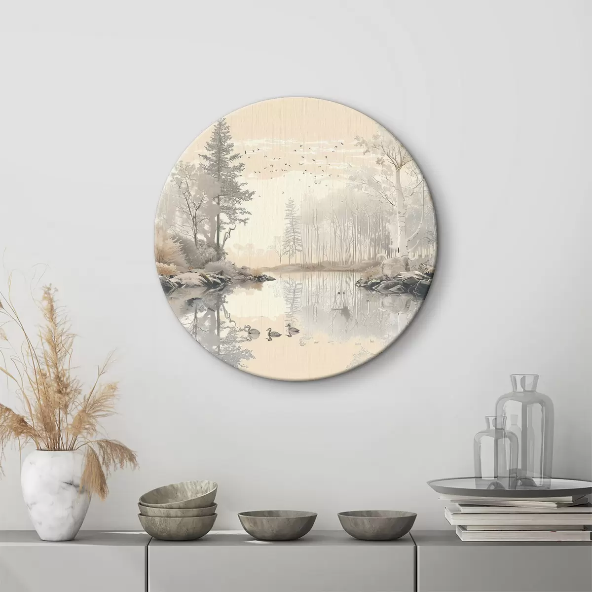 Okrągły obraz Piękny krajobraz natury, staw i drzewa, dzika przyroda, delikatne pastelowe kolory Nr r39980
