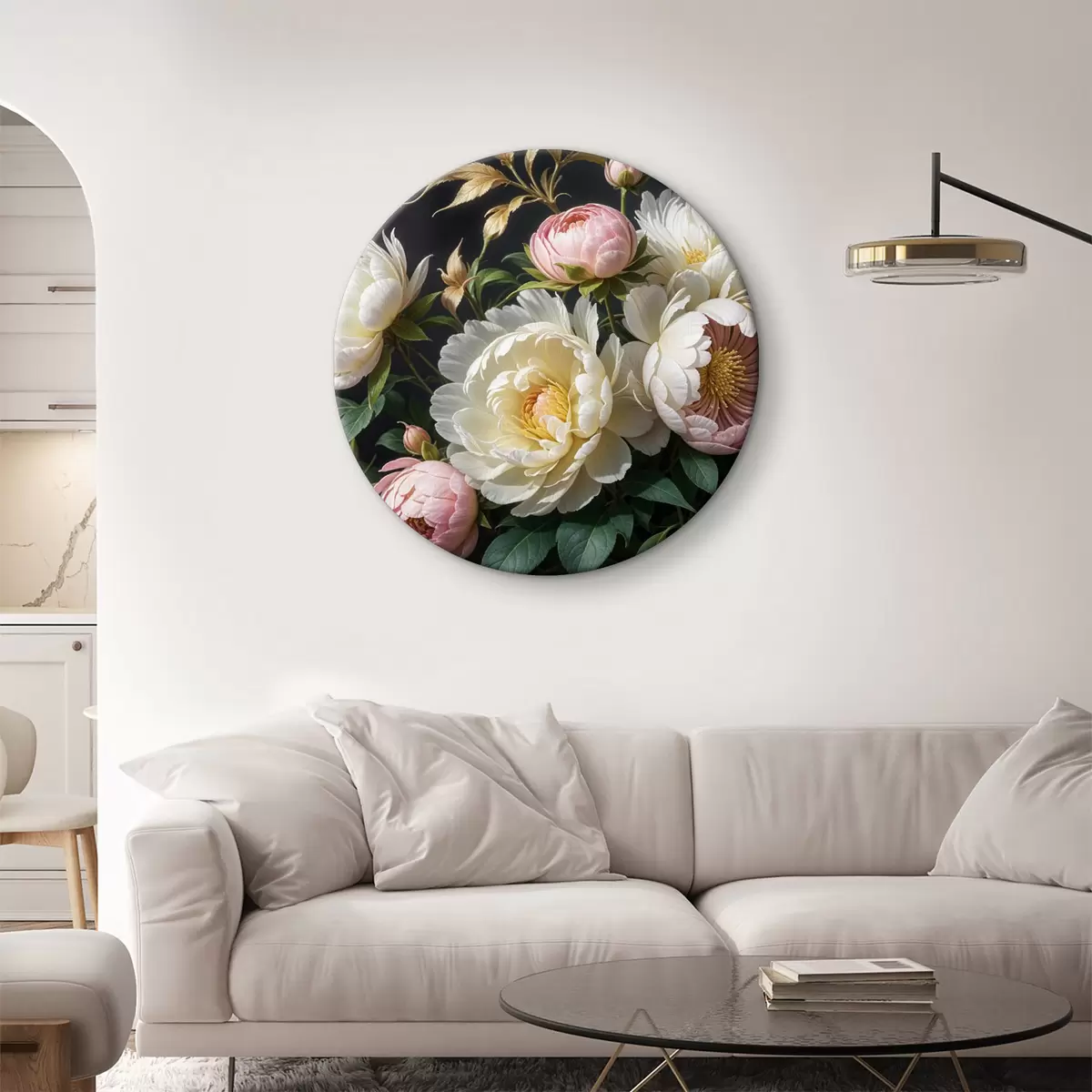 Okrągły obraz Bukiet dużych, bujnych białych i różowych kwiatów piwonii z zielonymi liśćmi na ciemnym tle Nr r40014