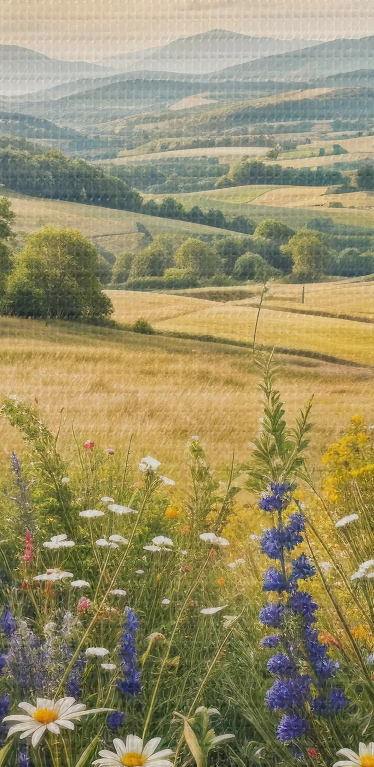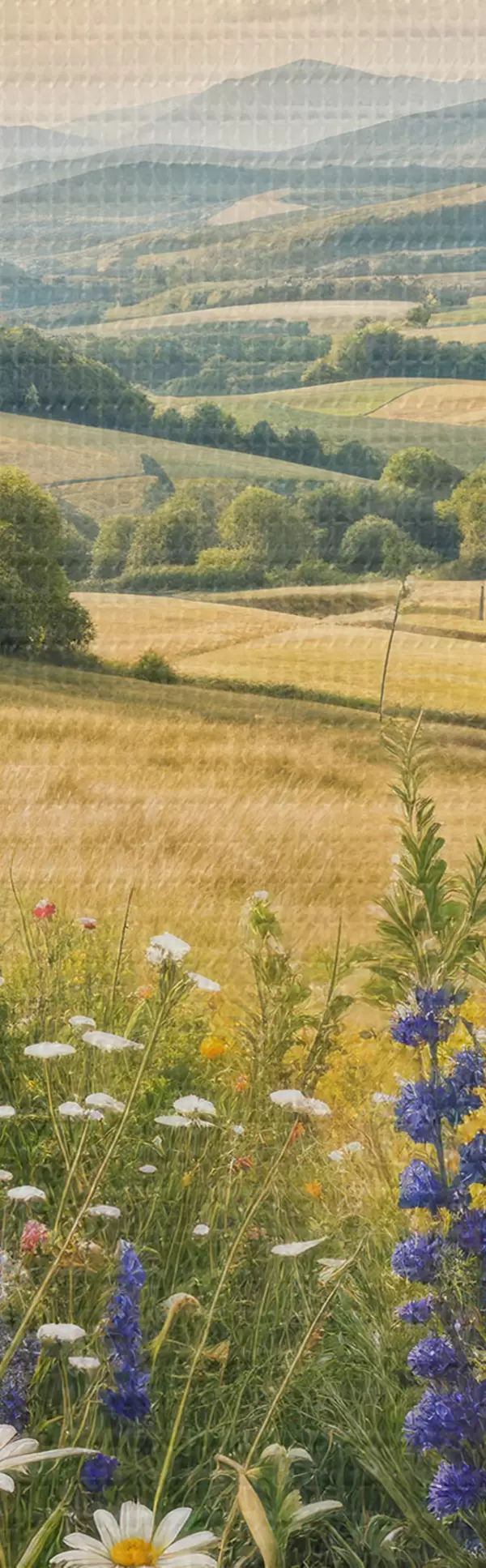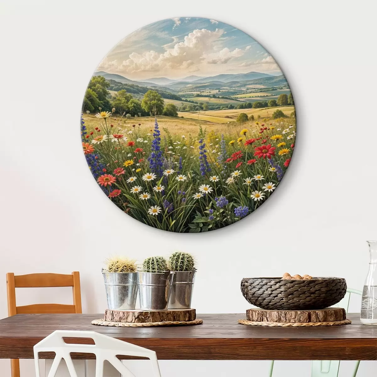 Okrągły obraz Bujny wiejski krajobraz z żywą łąką pełną kolorowych kwiatów pod zachmurzonym niebem Nr r40018