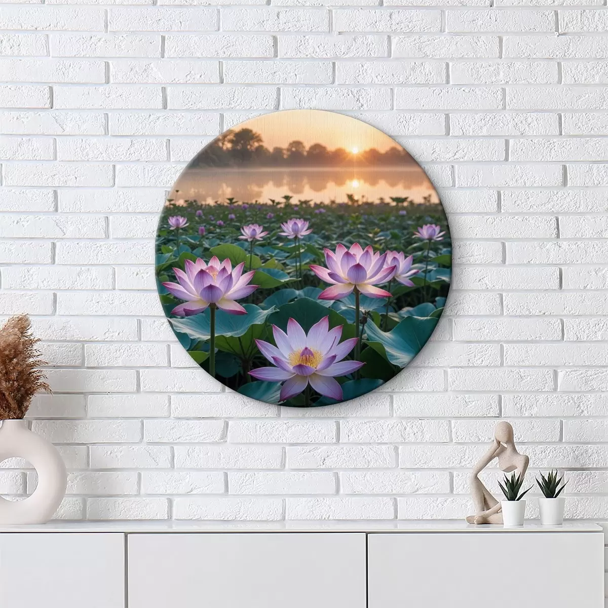Okrągły obraz Pole różowych kwiatów lotosu kwitnących na mglistym jeziorze o zachodzie słońca, w tle sylwetki palm Nr r40020
