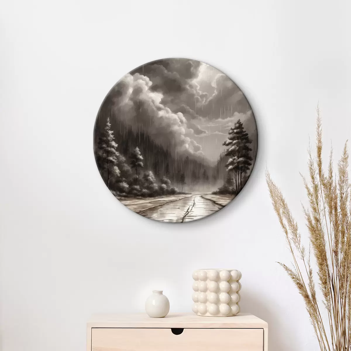 Okrągły obraz Droga w lesie w ulewnym deszczu Nr r40064