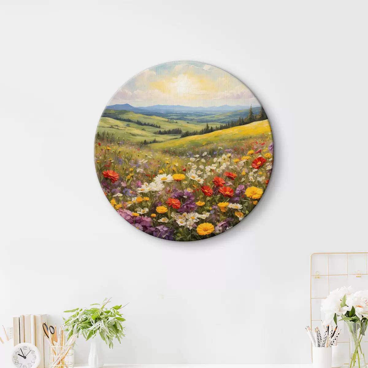 Okrągły obraz Pole kwiatów o zachodzie słońca Nr r40073