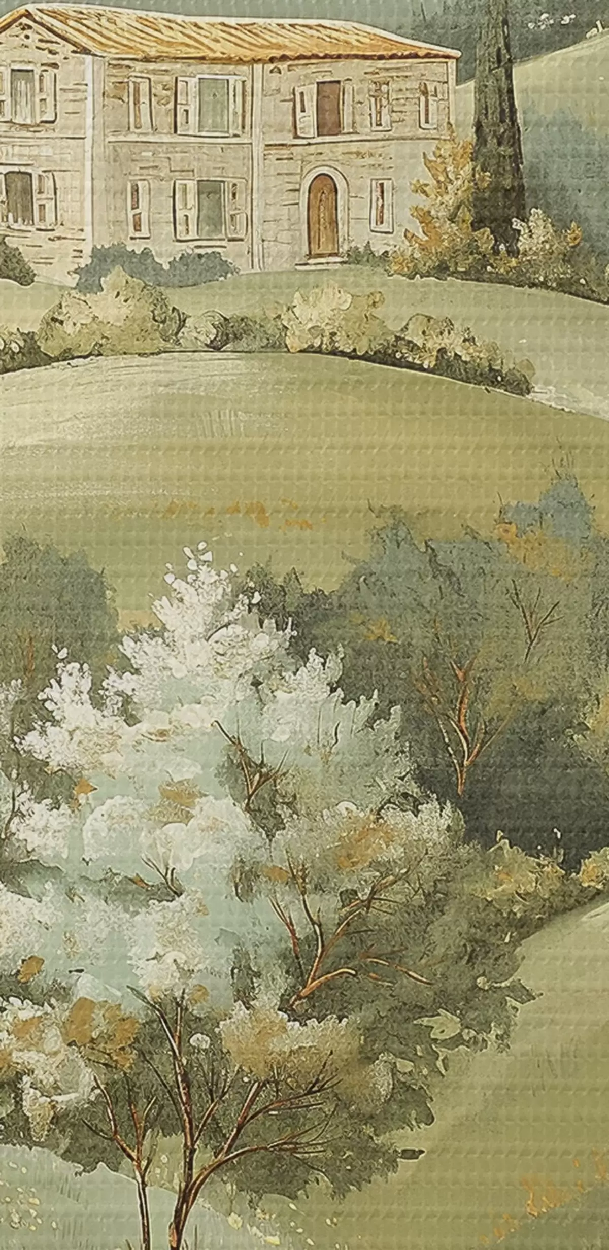Okrągłe obrazy Krajobraz ze starymi domami, pastelowe zielone kolory, rysunek akrylowy, lato r40078