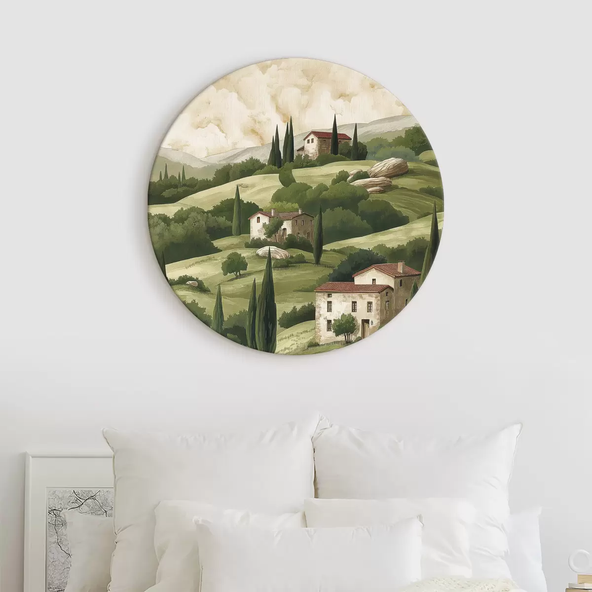Okrągły obraz Krajobraz ze starymi domami, pastelowe zielone kolory, rysunek akrylowy, rustykalny Nr r40080
