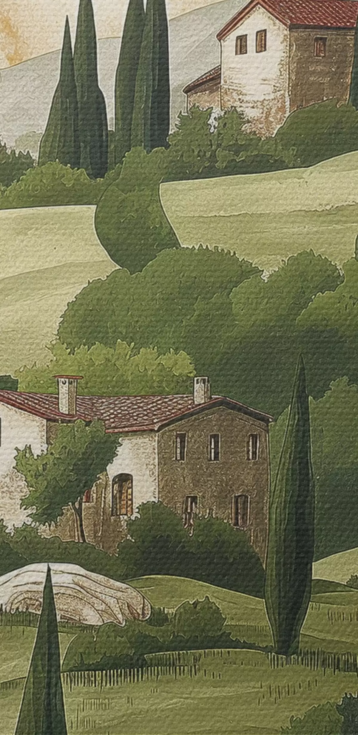 Okrągłe obrazy Krajobraz ze starymi domami, pastelowe zielone kolory, rysunek akrylowy, rustykalny r40080