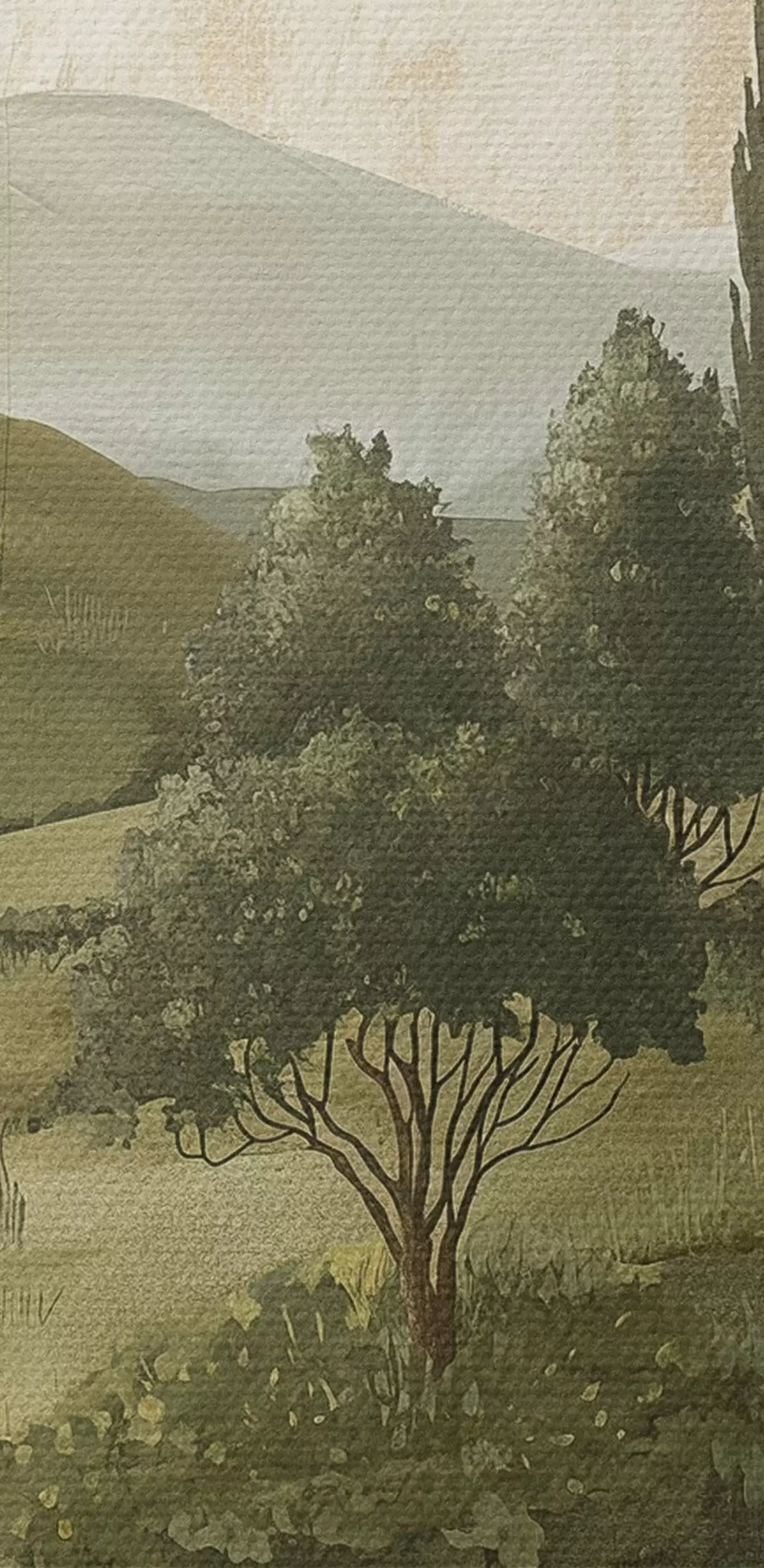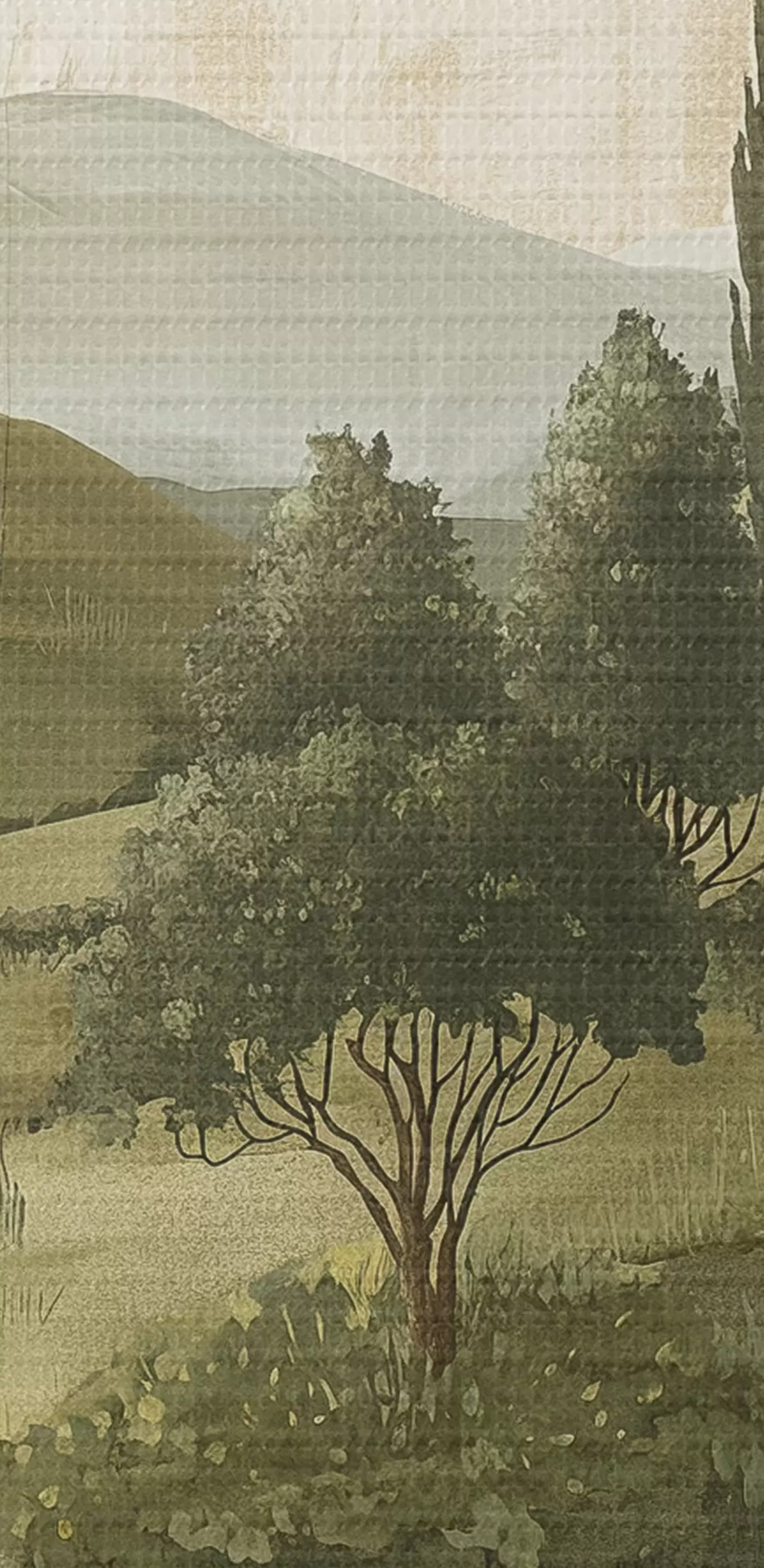 Okrągły obraz Krajobraz w stylu vintage, styl rustykalny, pastelowe kolory, łąka z kwiatami i drzewami Nr r40081