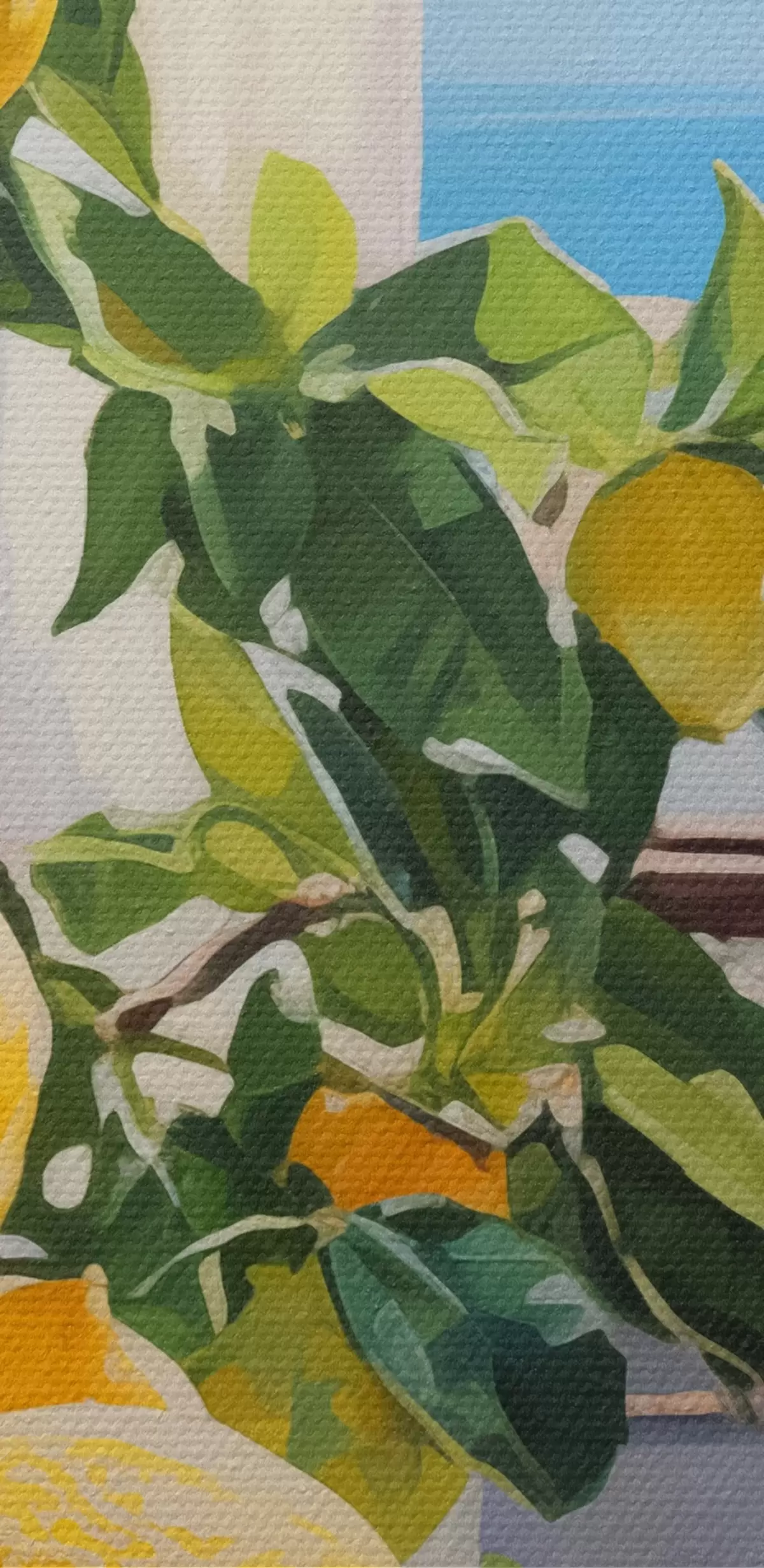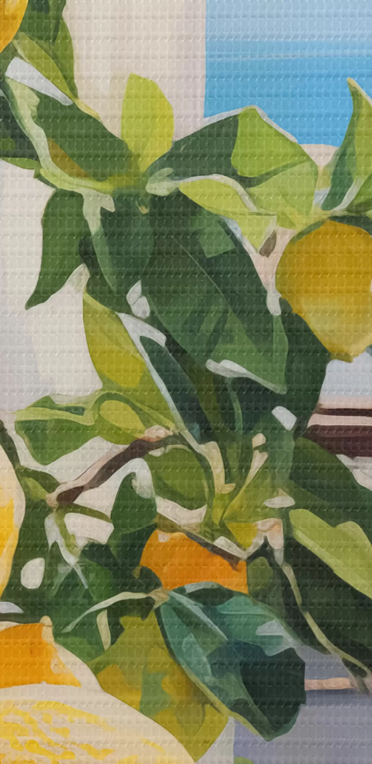 Okrągły obraz Cytryny na drzewie i stół na balkonie hotelowym z widokiem na morze, imitacja obrazu olejnego Nr r40091