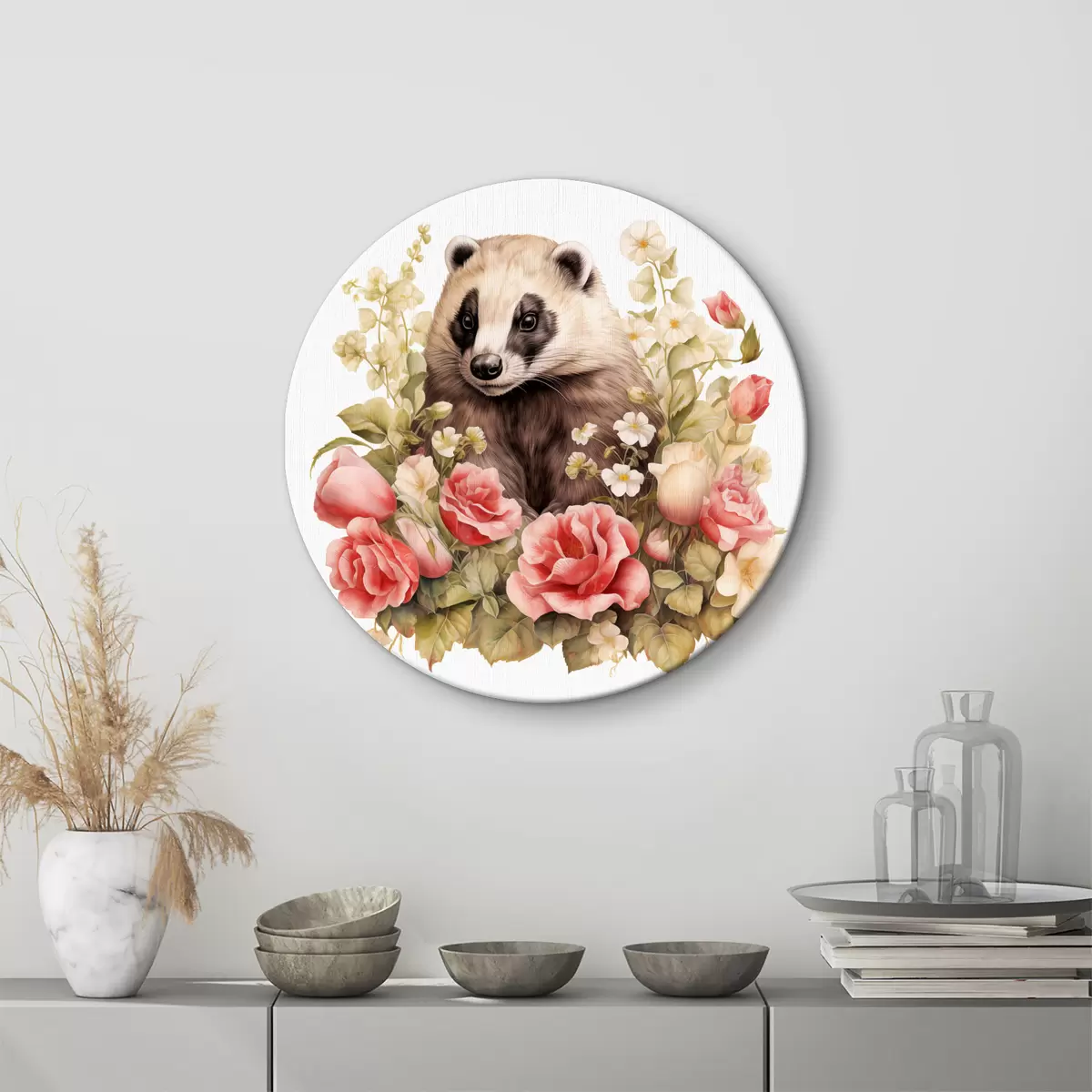 Okrągły obraz Portret borsuka w różowych akwarelach z różami vintage Nr r40094