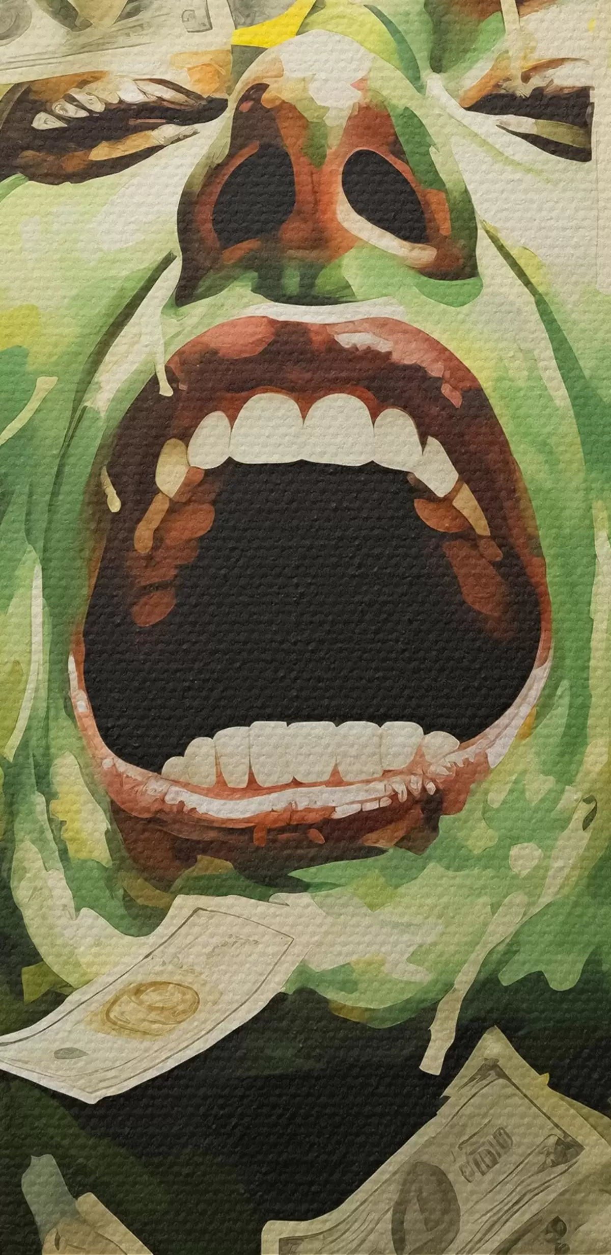 Okrągły obraz Portret zielonej kobiety na żółtym, krzyk, papierowe banknoty, imitacja pieniędzy malarstwa olejnego Nr r40096