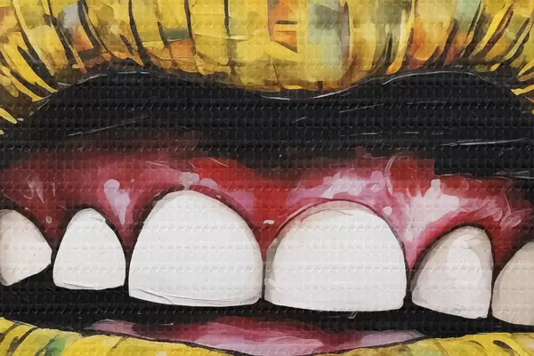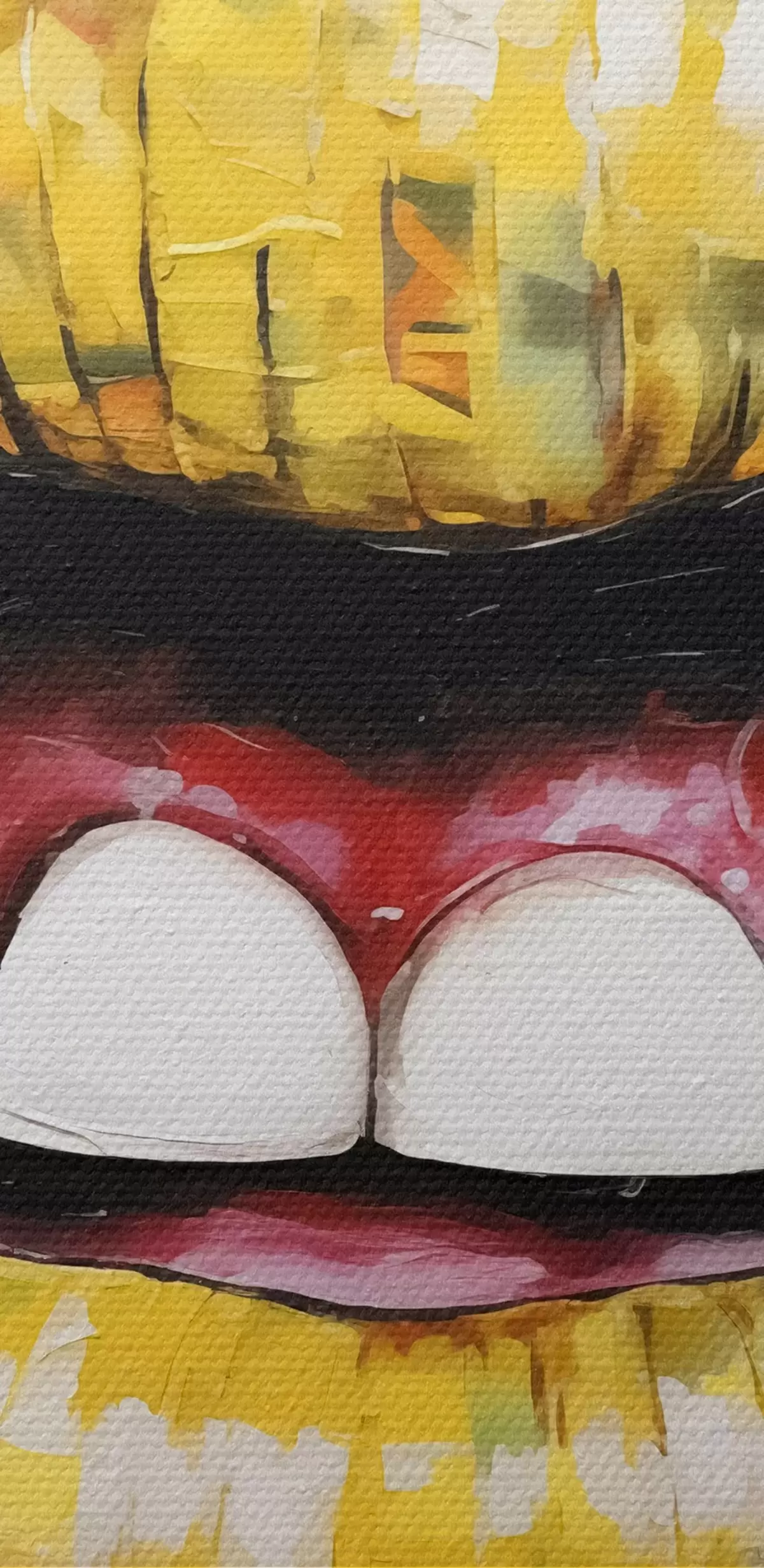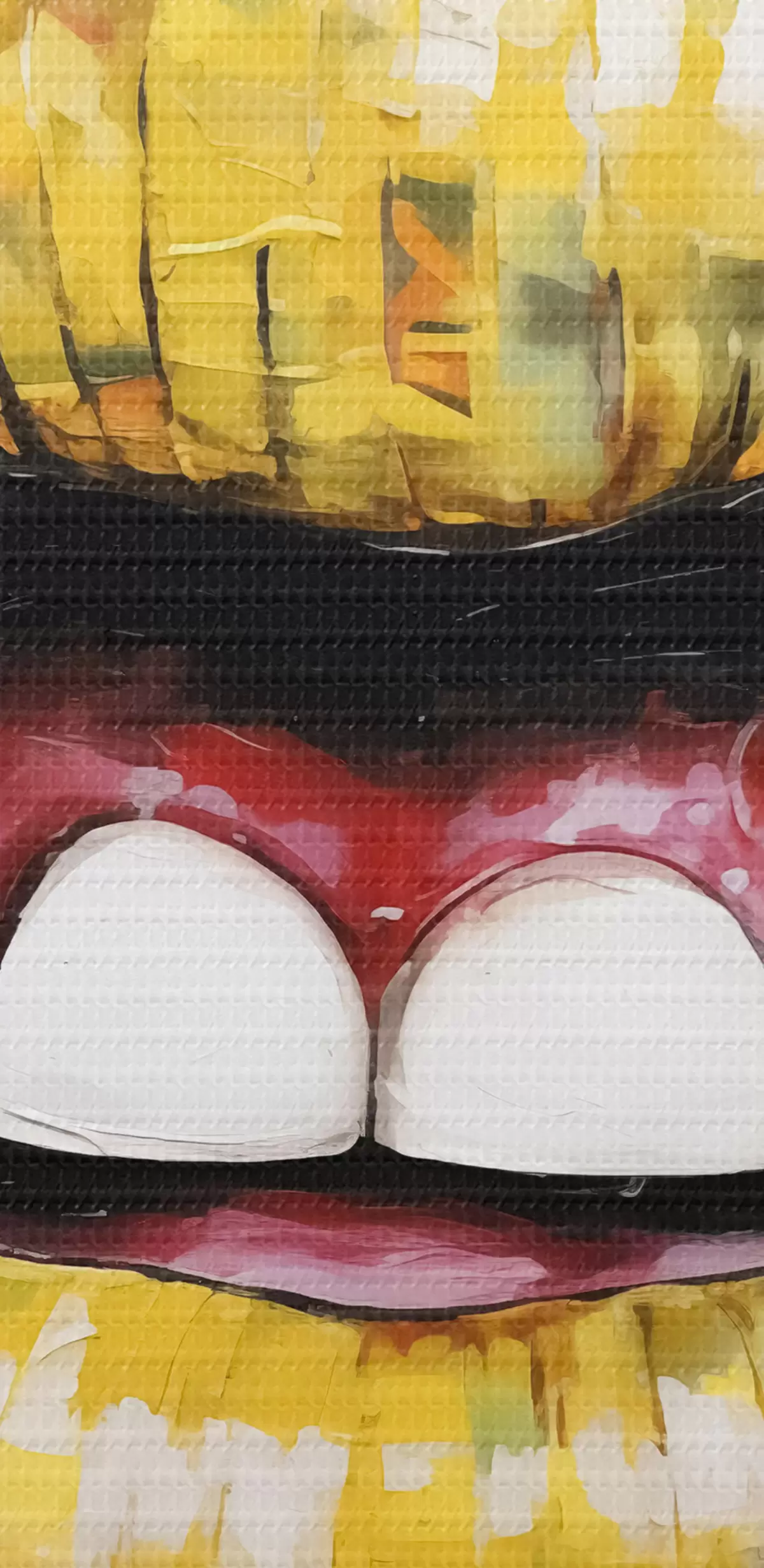 Okrągły obraz Żółte usta, białe zęby, twarz w banknotach imitująca malarstwo olejne Nr r40098