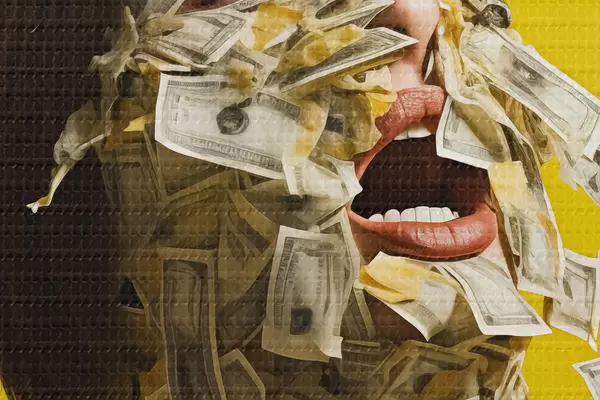 Okrągły obraz Twarz dziewczyny pokryta papierowymi rachunkami, pieniędzmi, żółte tło Nr r40099