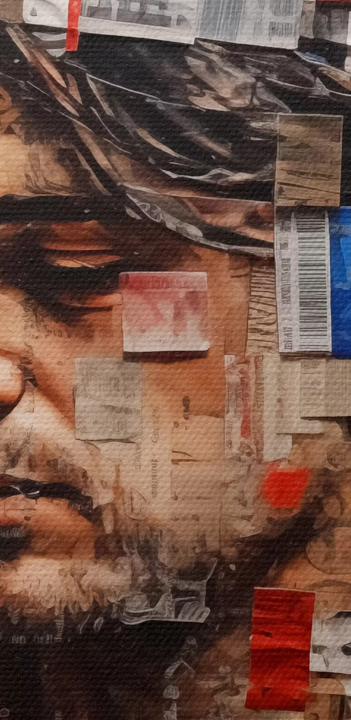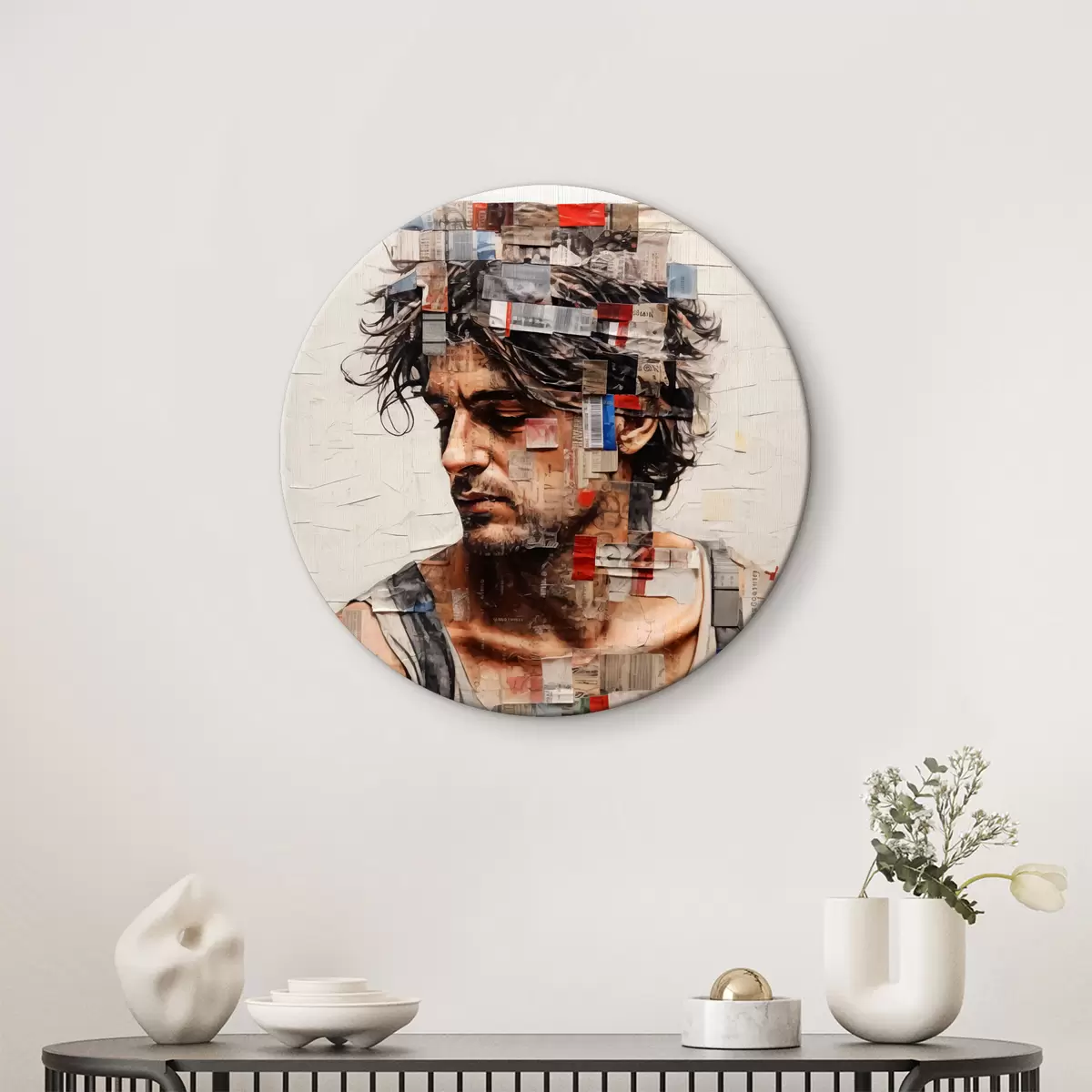 Okrągły obraz Mężczyzna z kręconymi włosami pokryty naklejkami, znaczkami i kodem kreskowym Nr r40103
