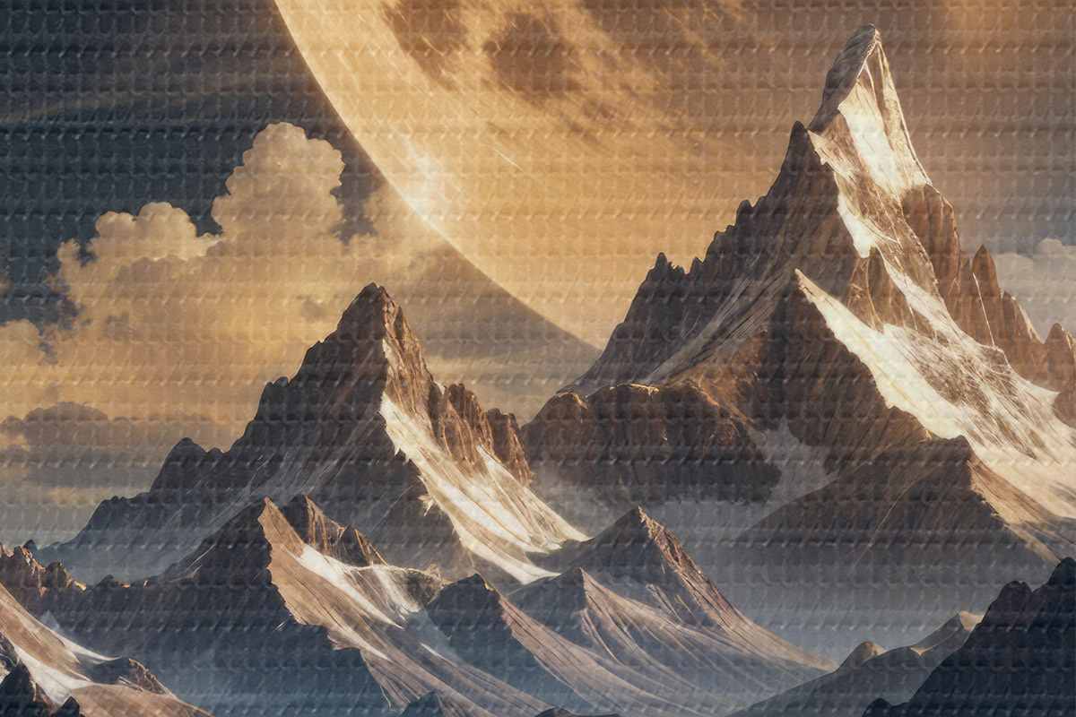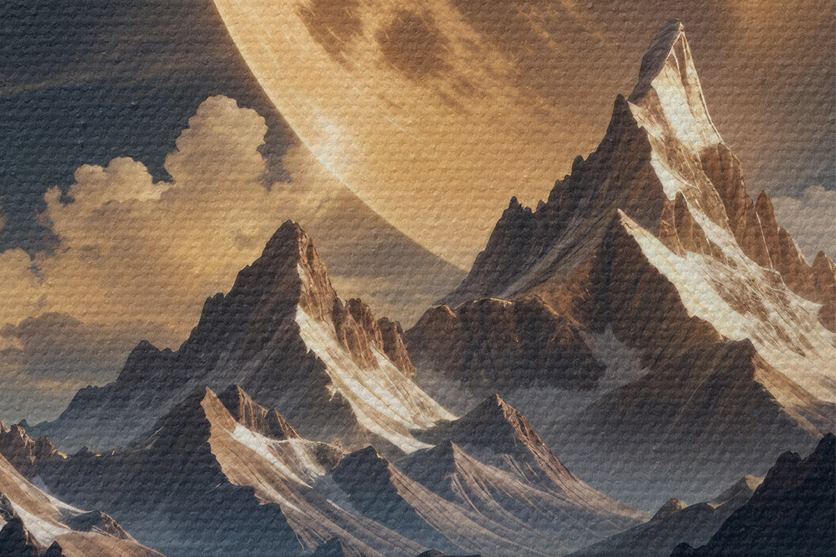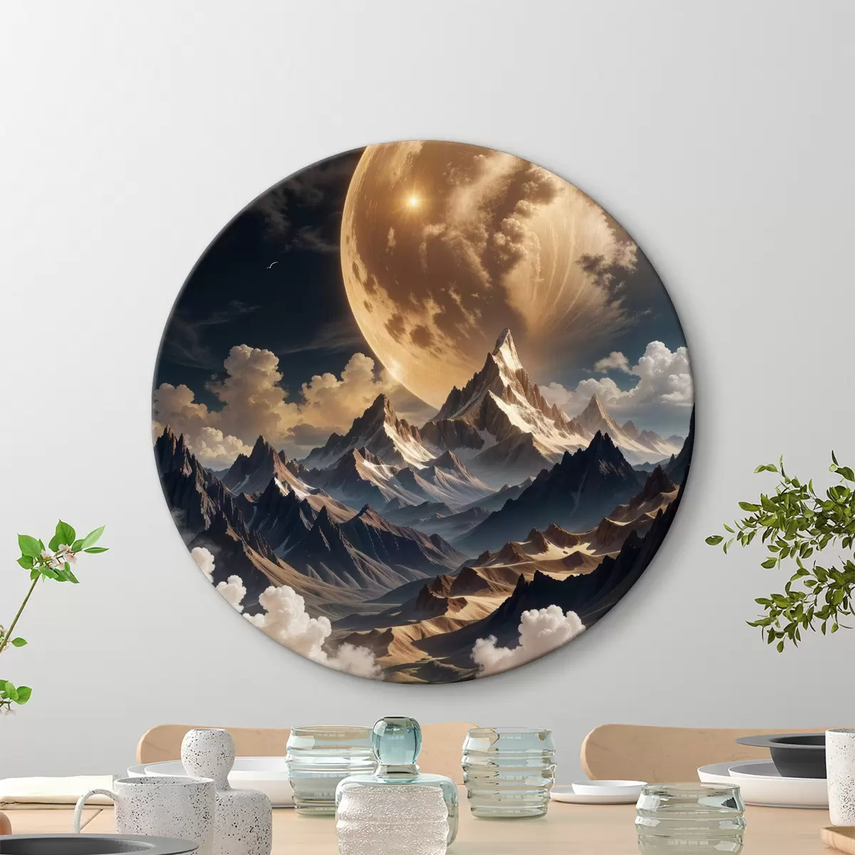 Okrągły obraz Surrealistyczny krajobraz z ośnieżonymi górami pod ogromnym księżycem w pełni i delikatnymi chmurami Nr r40147