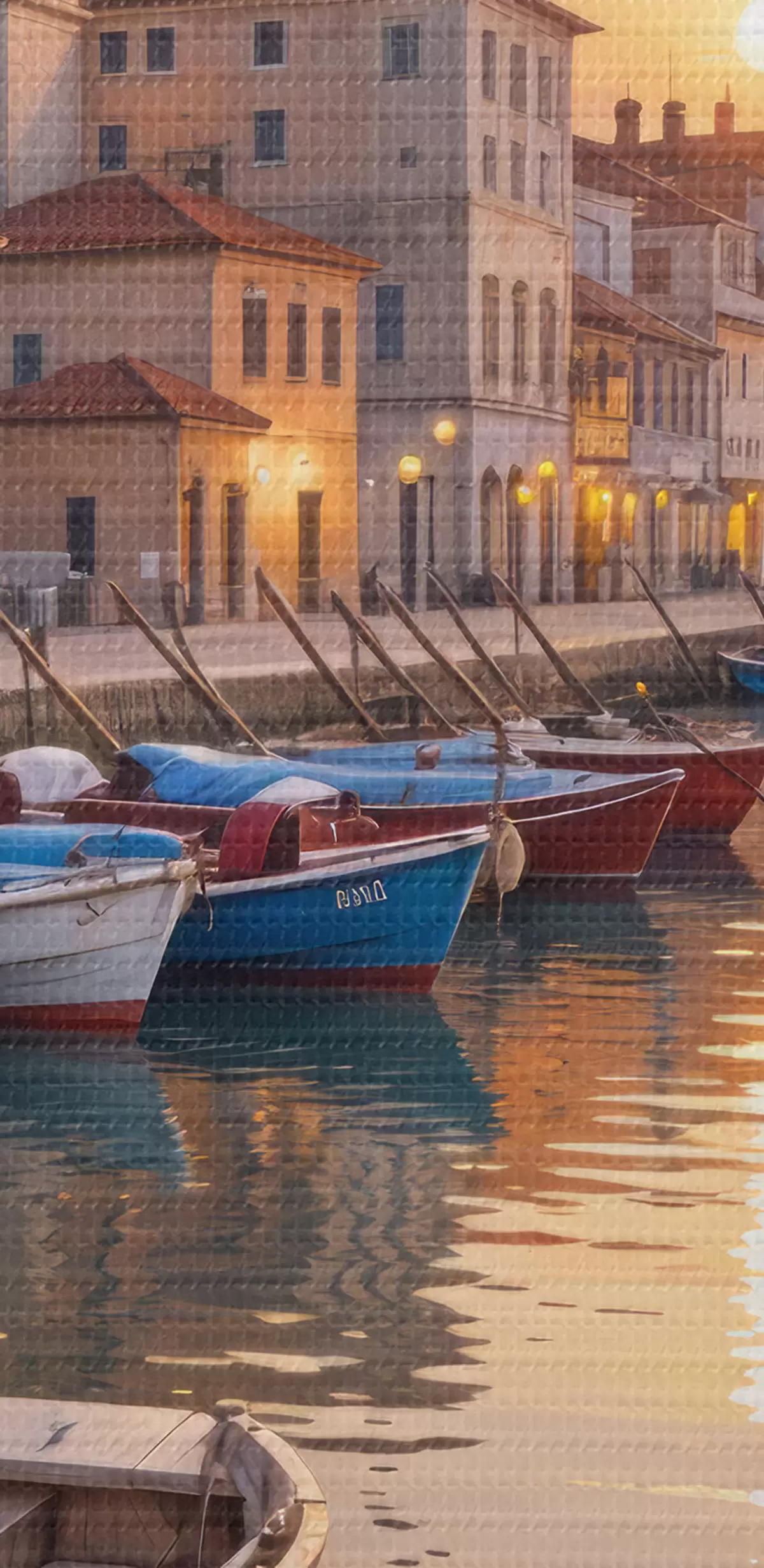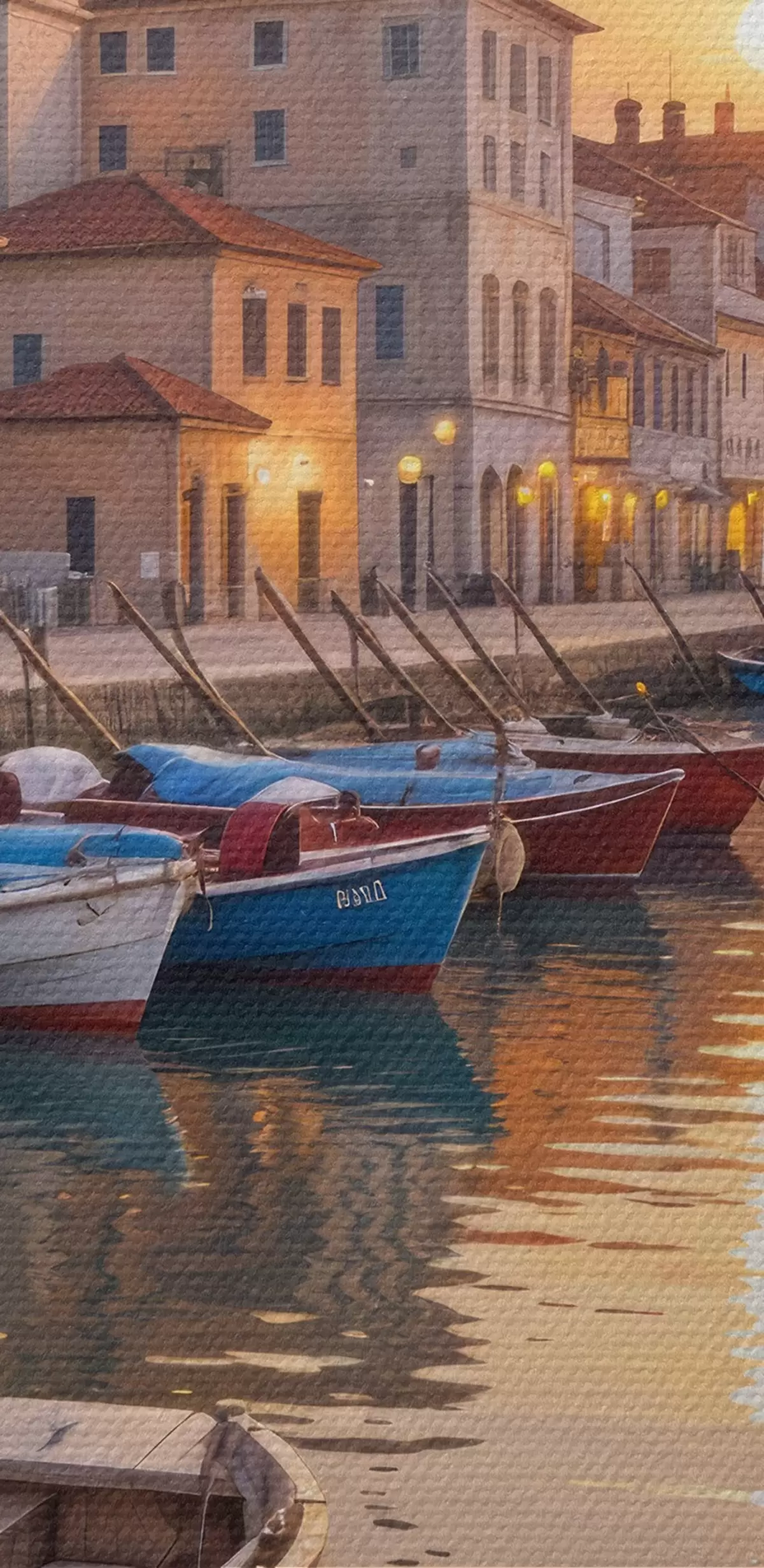 Okrągły obraz Włoskie nadmorskie miasteczko o zachodzie słońca, kolorowe budynki wzdłuż nabrzeża i łodzie dryfujące po spokojnych wodach Nr r40150