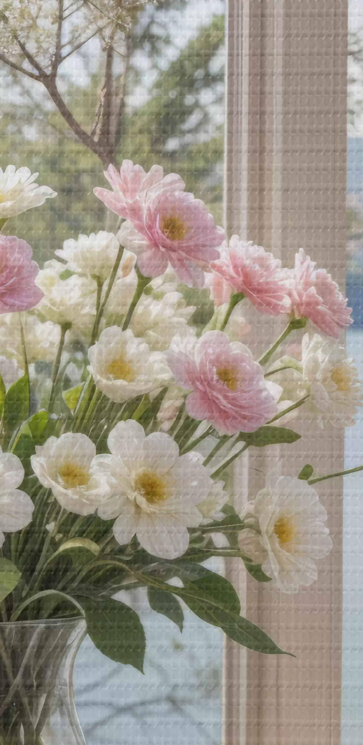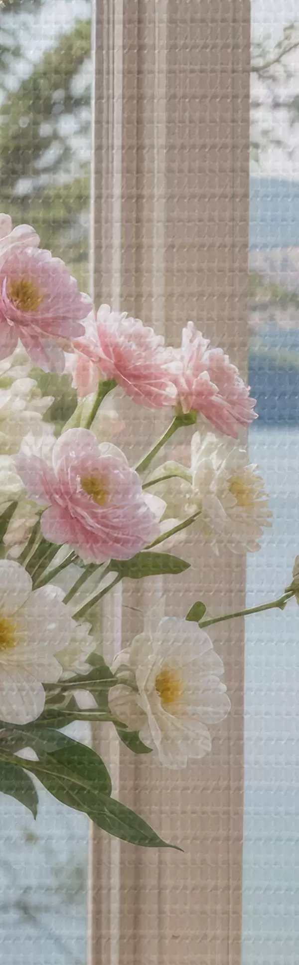 Okrągły obraz Bukiet różowych i białych kwiatów w szklanym wazonie umieszczonym na parapecie, z widokiem na malownicze jezioro i góry Nr r40151
