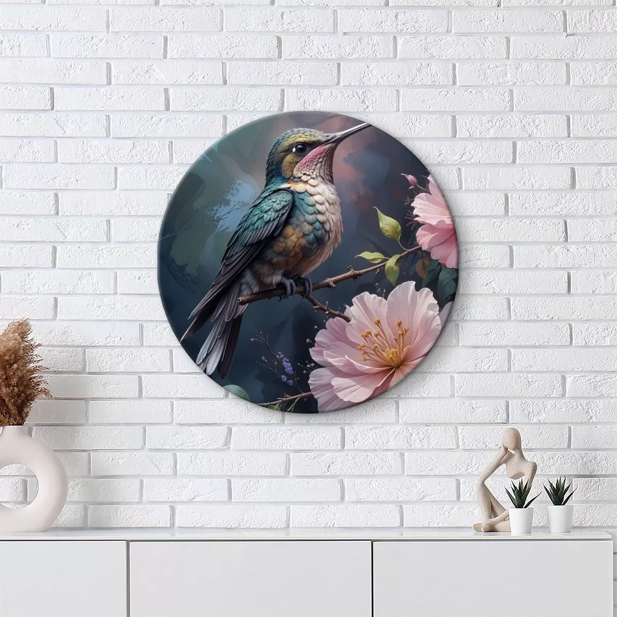 Okrągły obraz Kolorowy koliber siedzący na gałęzi z żywymi różowymi kwiatami w tle Nr r40155