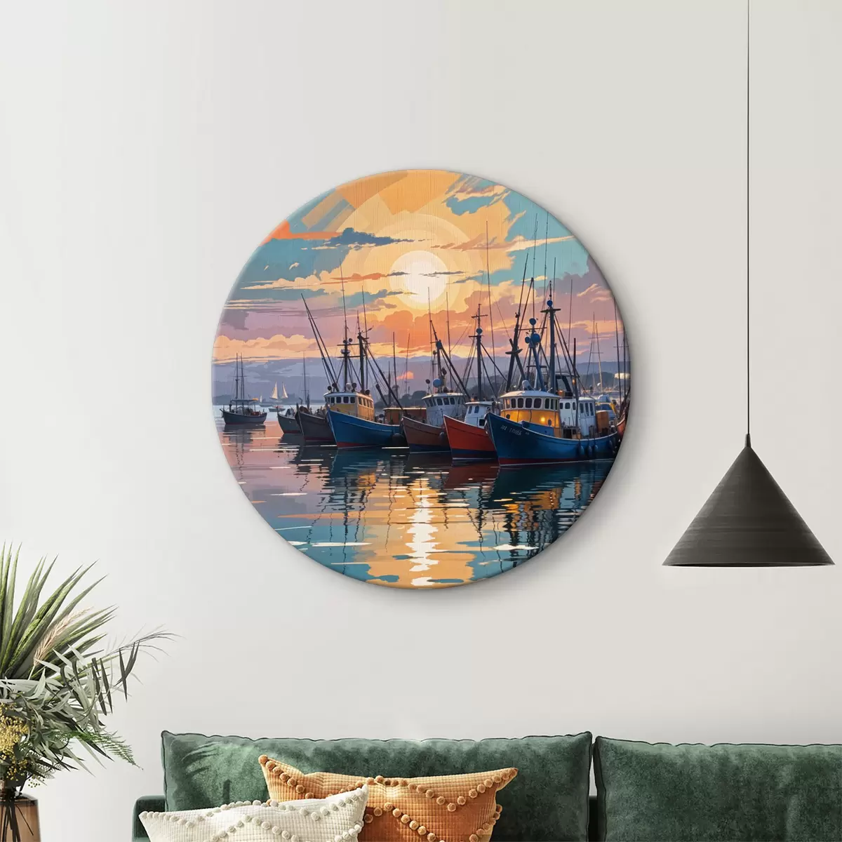 Okrągły obraz Kolorowy zachód słońca nad portem pełnym łodzi rybackich i statków tworzy spokojną i malowniczą scenerię Nr r40158