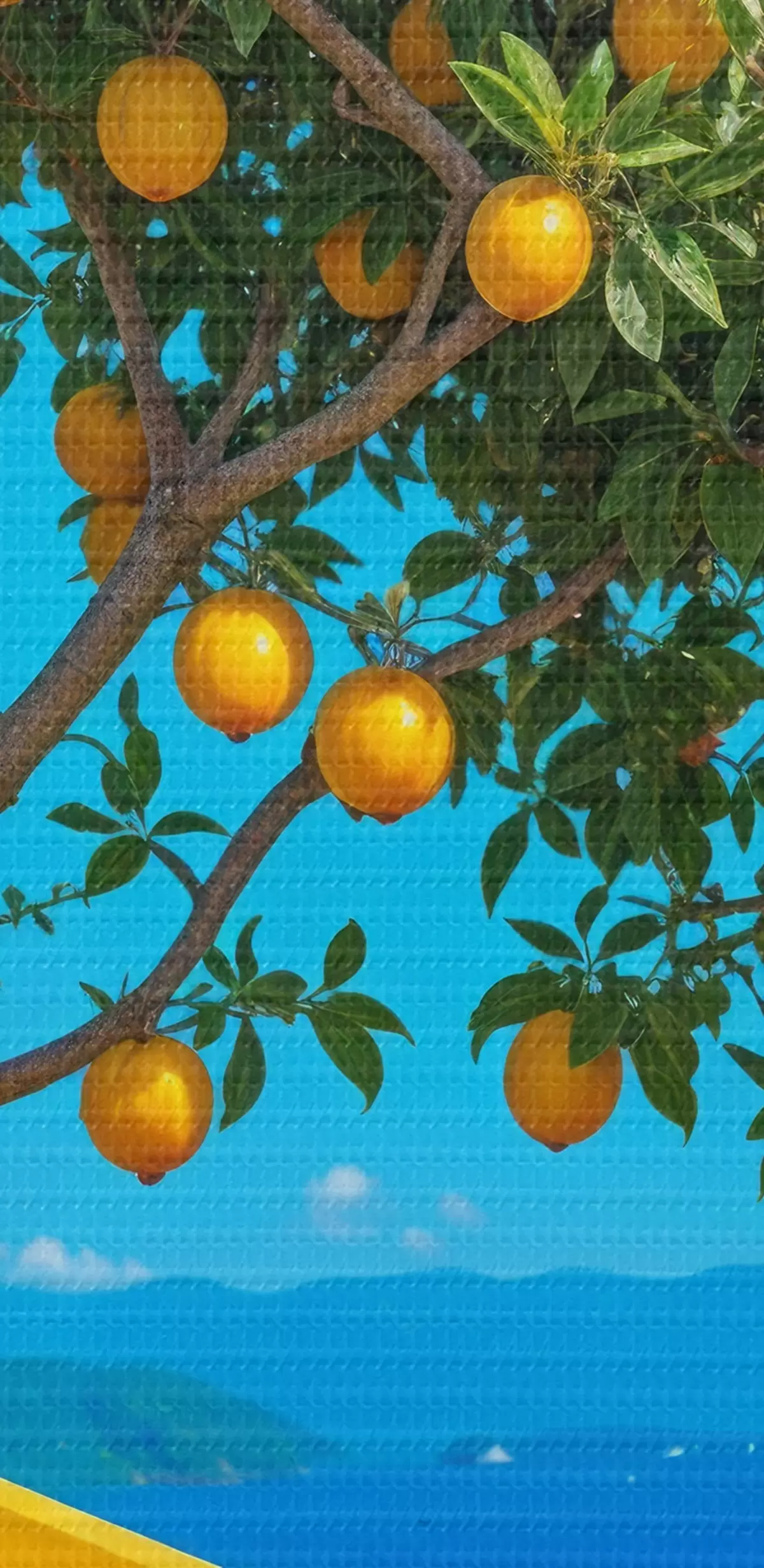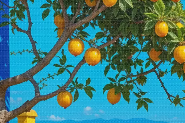 Okrągły obraz Drzewo pomarańczowe z dojrzałymi owocami rosnące na budynku z niebieską ścianą i dachem pokrytym dachówką z widokiem na ocean Nr r40159