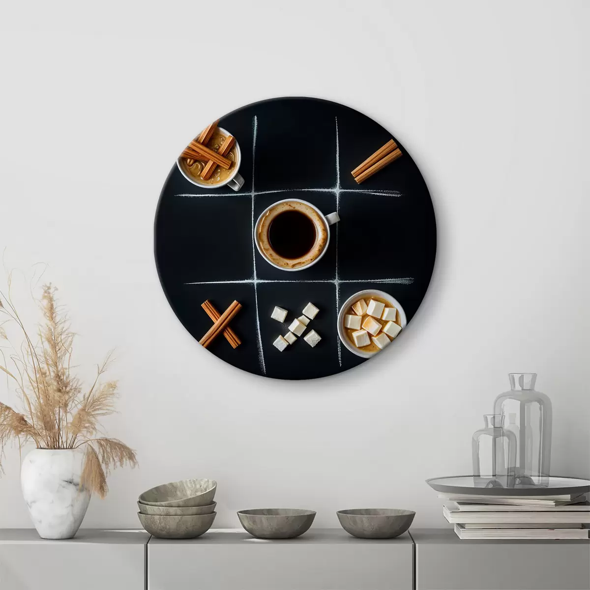 Okrągłe obrazy Filiżanka kawy z laskami cynamonu, kostkami cukru i piankami ułożonymi w kratkę przypominającą kółko i krzyżyk r40163