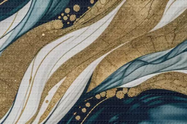 Okrągły obraz Wirująca, abstrakcyjna, teksturowana kompozycja z płynnymi, organicznymi kształtami w odcieniach niebieskiego, zielonego i żółtego Nr r40172