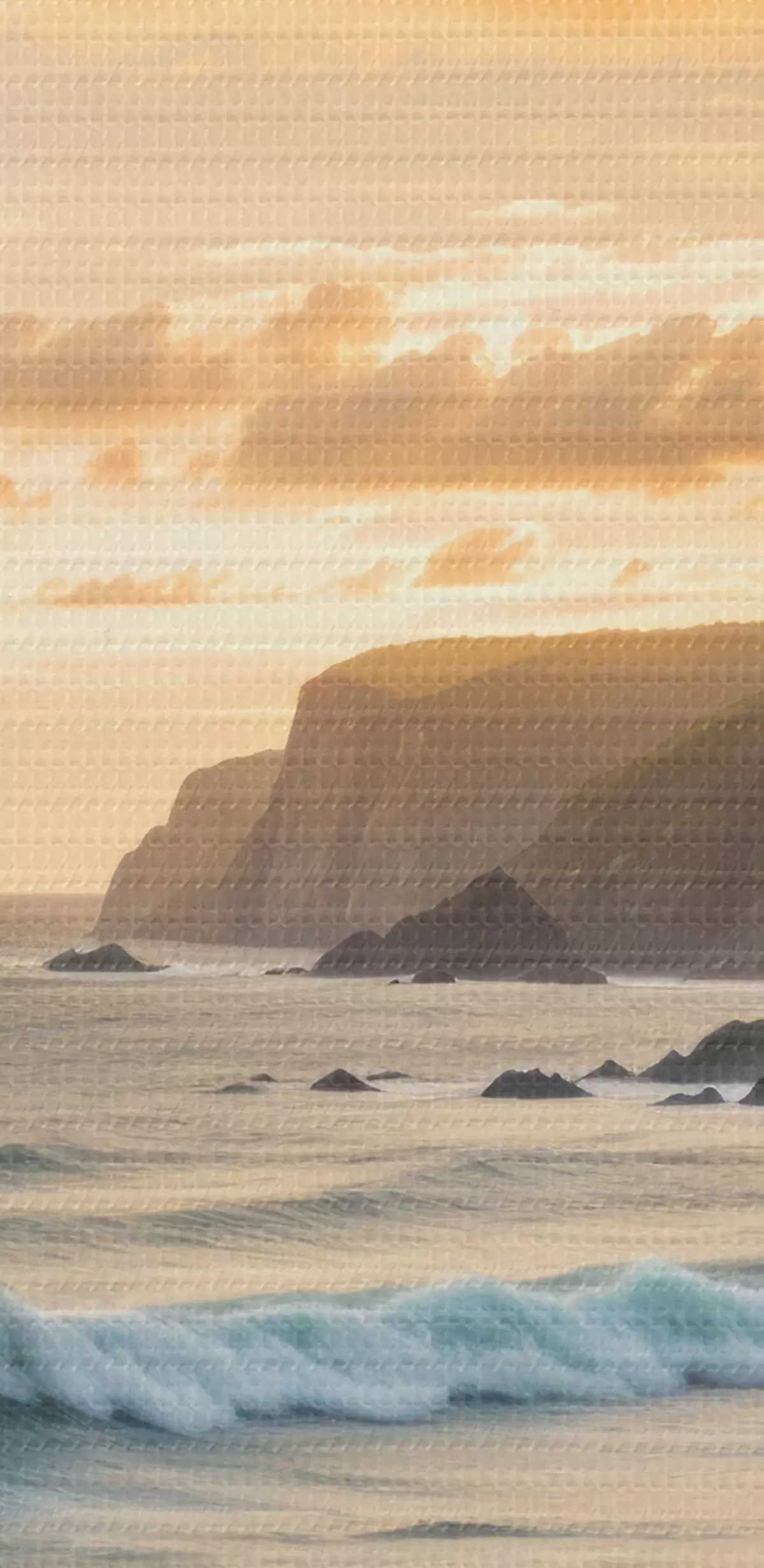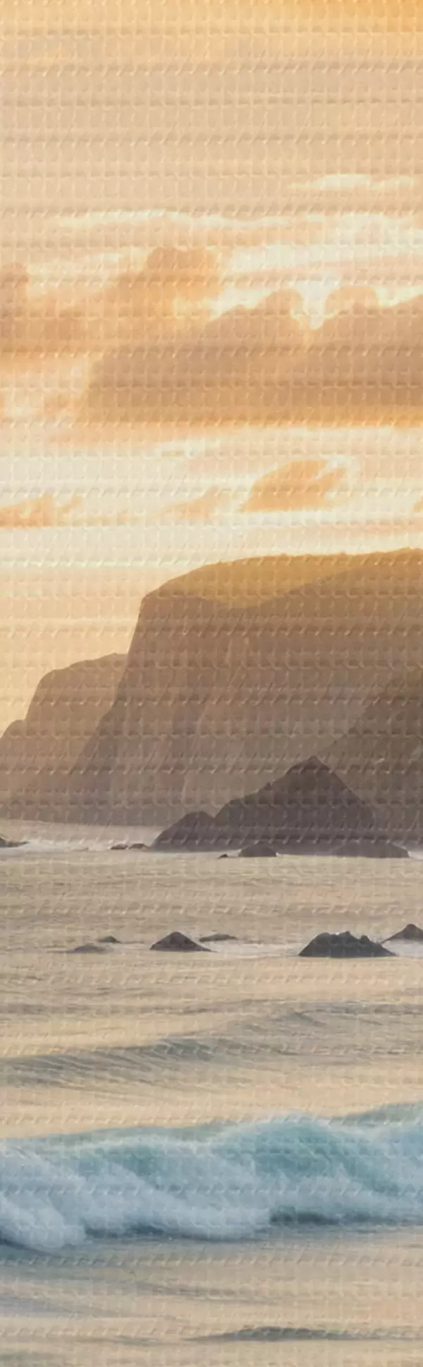 Okrągły obraz Malowniczy krajobraz wybrzeża z dramatycznymi klifami, rozbijającymi się falami i kolorowym niebem o zachodzie słońca Nr r40176