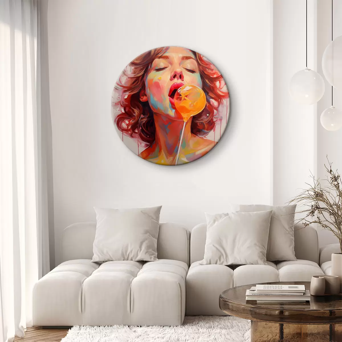 Okrągłe obrazy Dziewczyna z kręconymi włosami w jasnych kolorach liże lizaka r40213