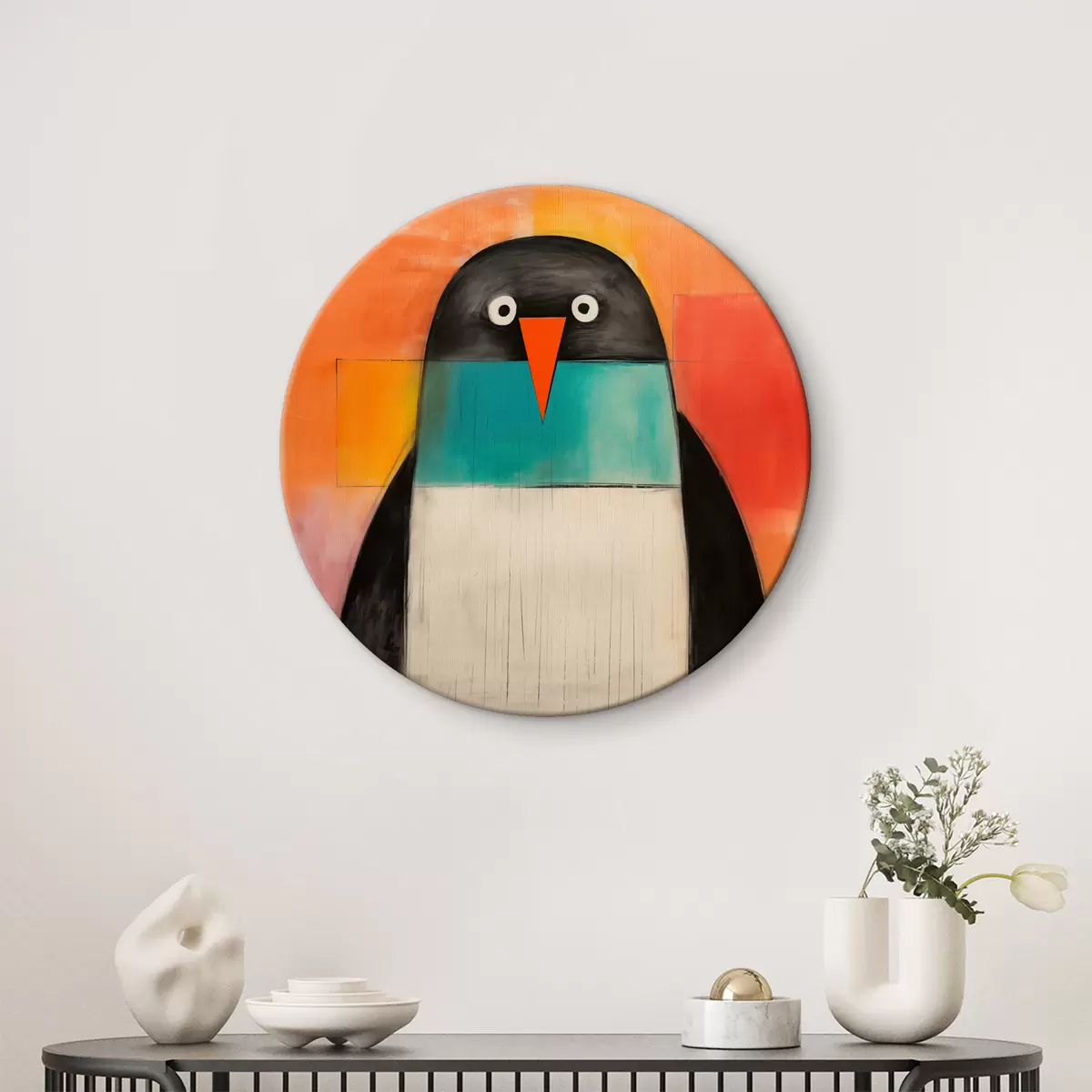 Okrągły obraz Pingwin na czerwono-pomarańczowym tle płaski rysunek Nr r40217