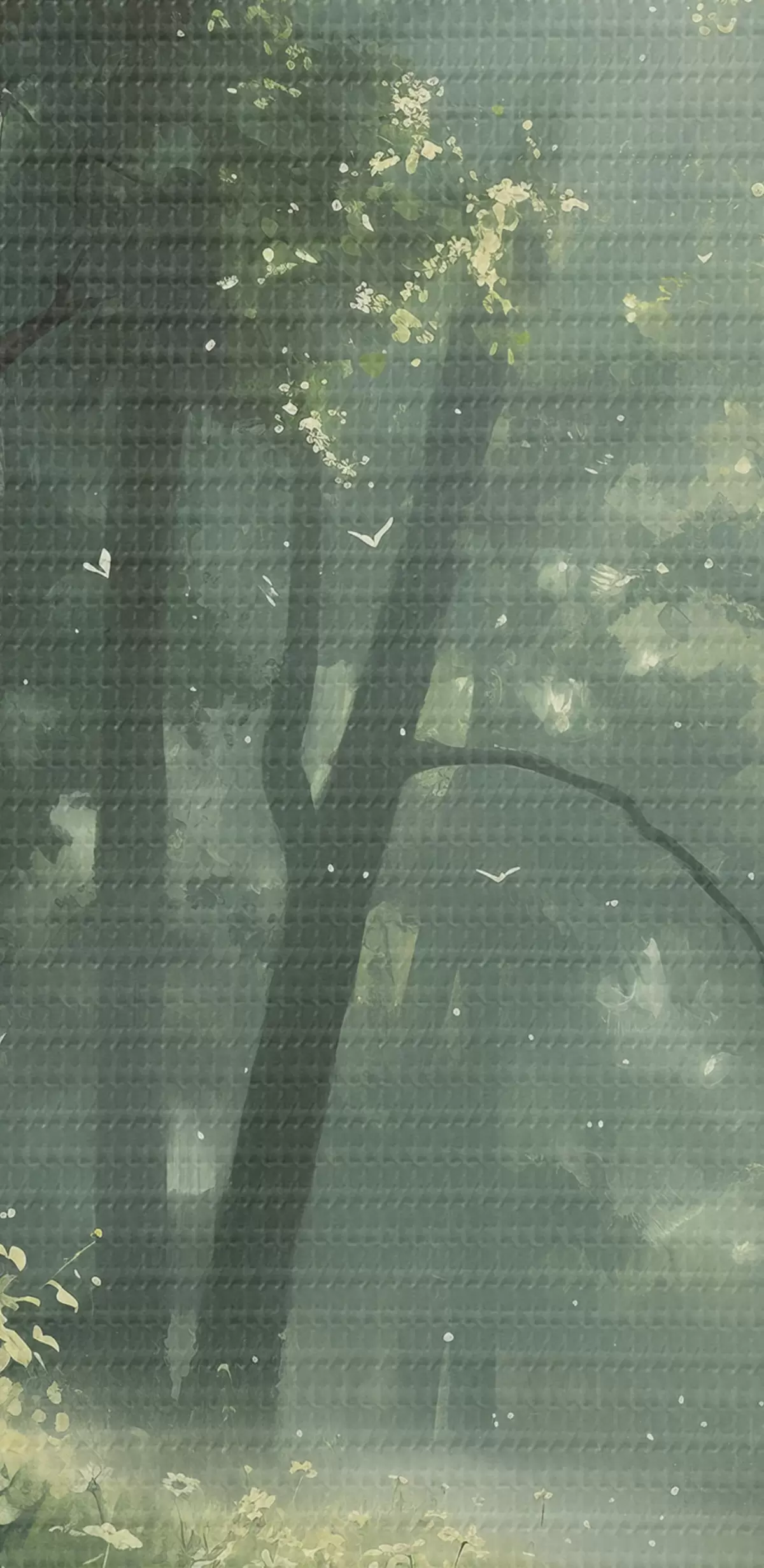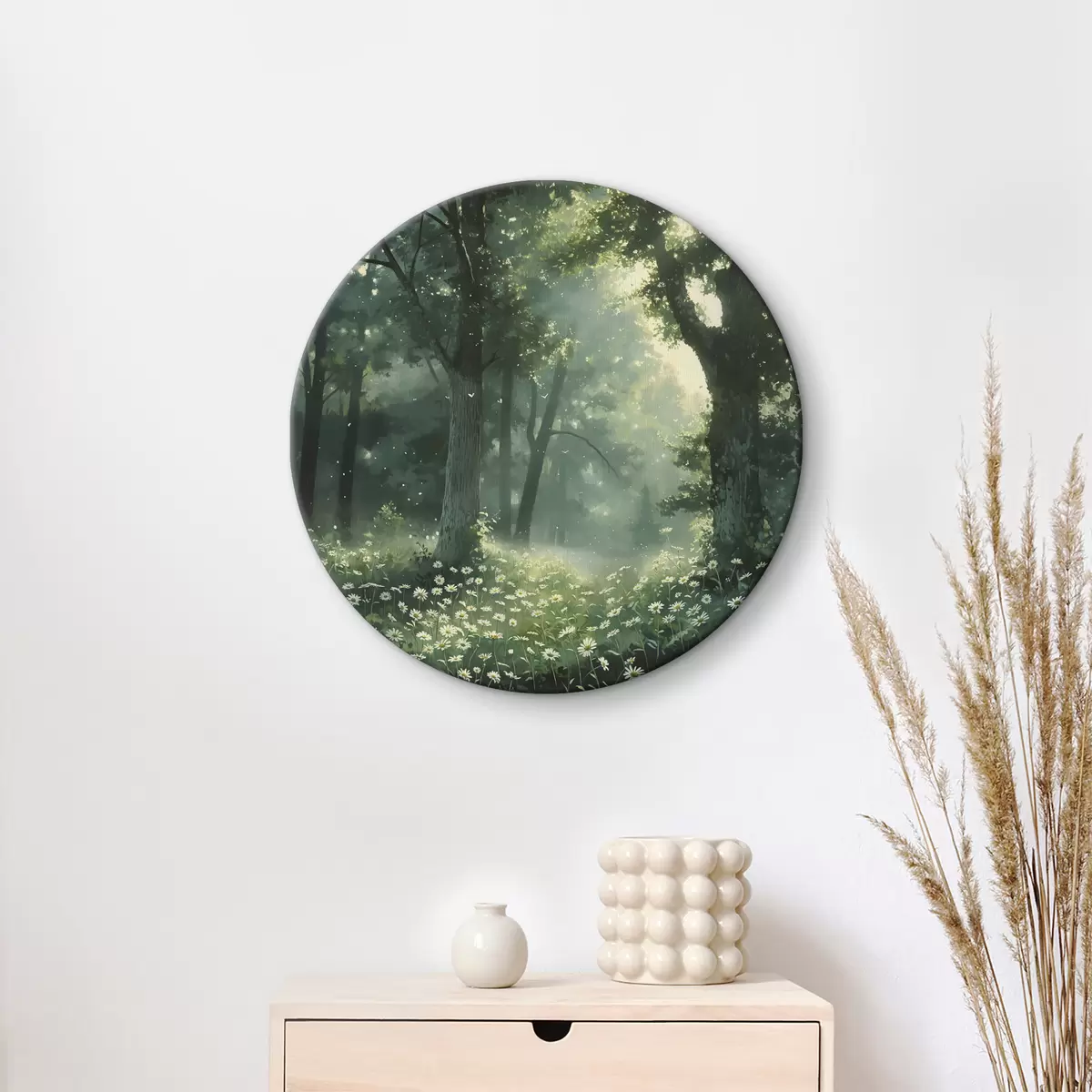 Okrągły obraz Gęsty las ze światłem słonecznym w drzewach, kwiatami rumianku, zieloną trawą, naturą Nr r40224