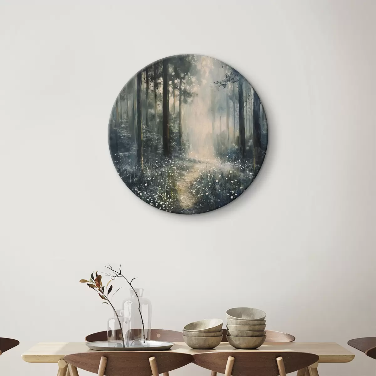 Okrągły obraz Gęsty las ze światłem słonecznym w drzewach, białymi kwiatami, zieloną trawą, obraz olejny Nr r40227