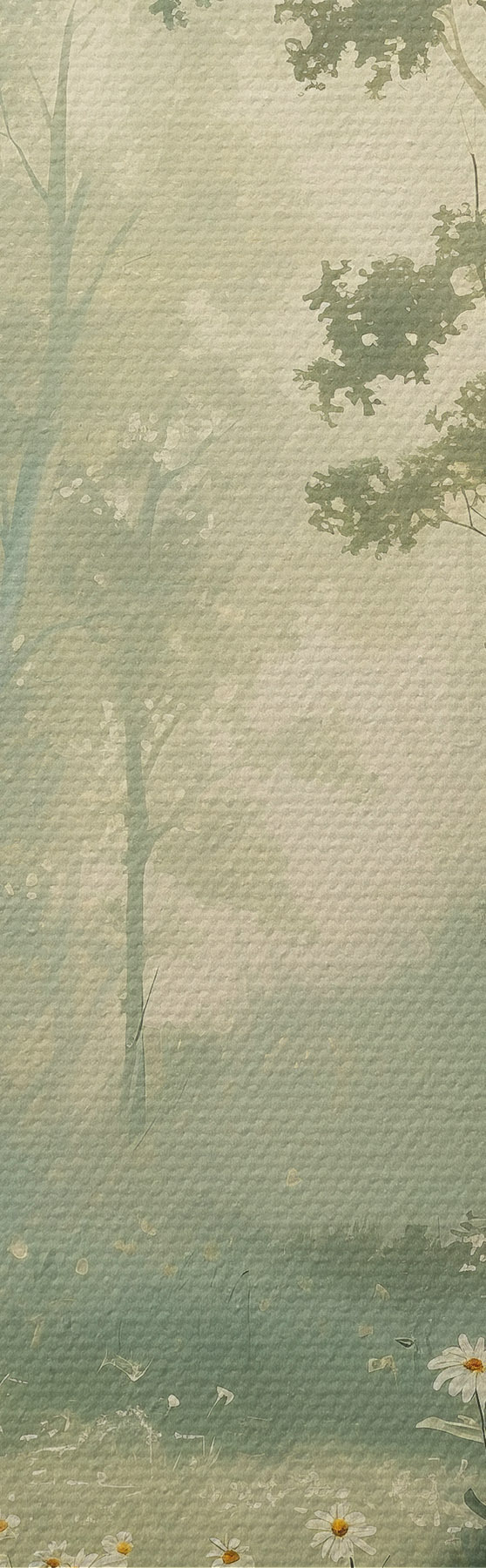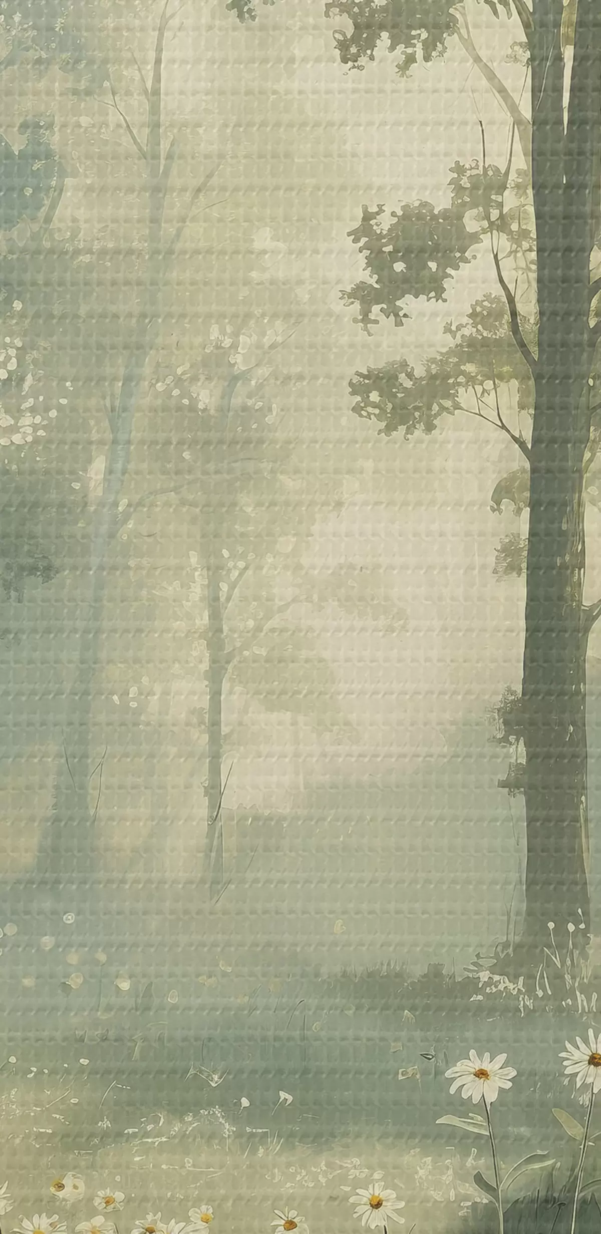 Okrągły obraz Las z miękkim światłem słonecznym, kwiaty rumianku, drzewa, zielona trawa, rysunek akrylowy Nr r40228