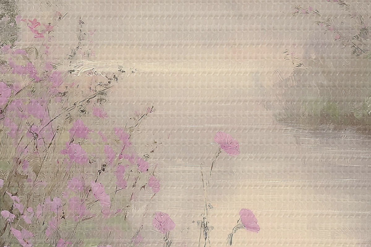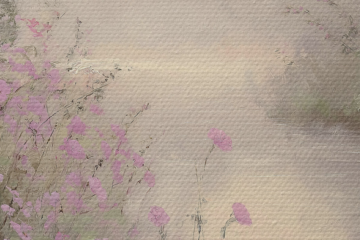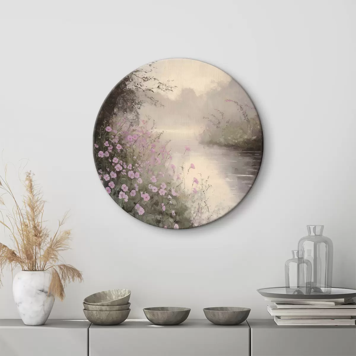 Okrągły obraz Jezioro z różowymi kwiatami, wschód słońca, rysunek olejny, pastelowe beżowe kolory, mgła Nr r40229