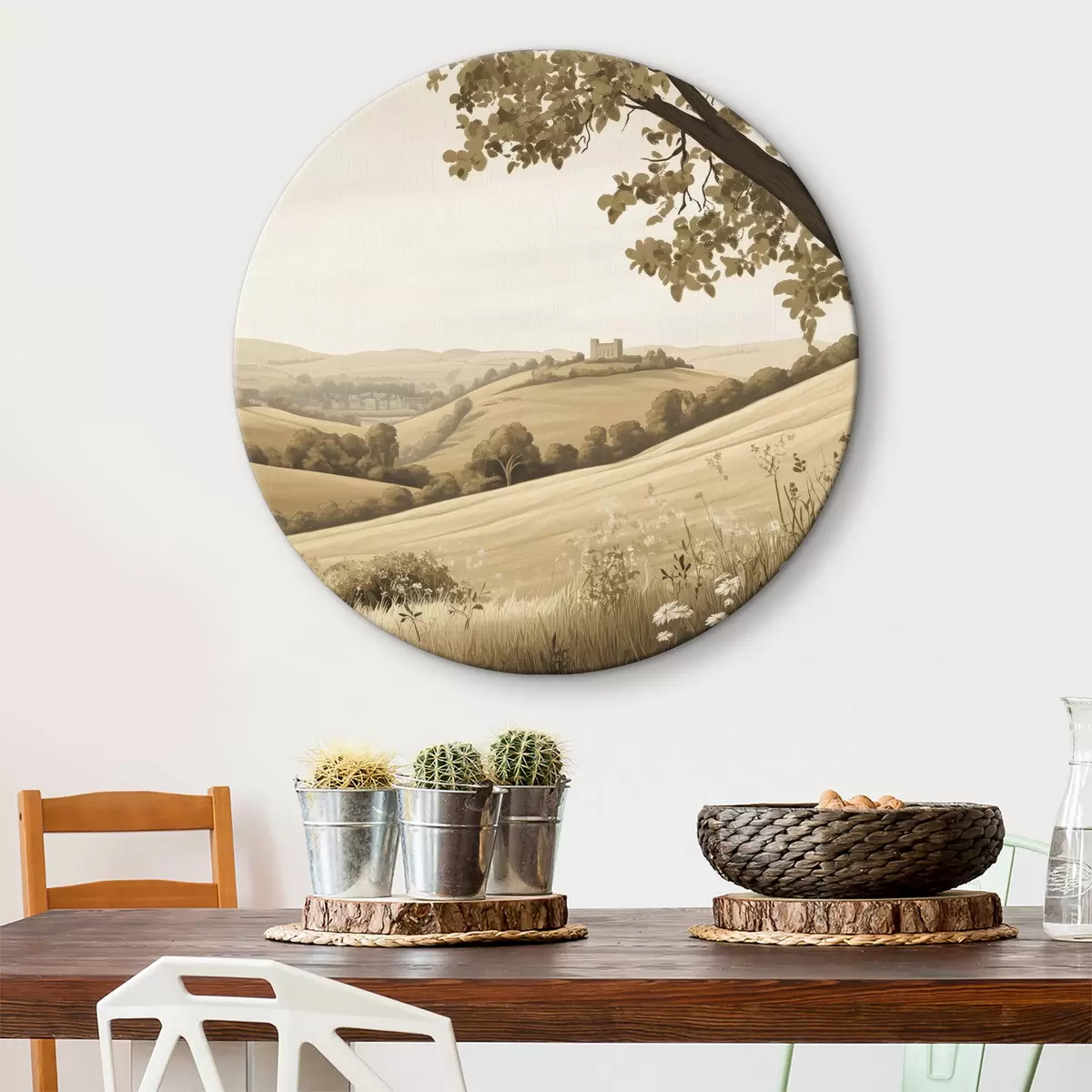 Okrągłe obrazy Krajobraz natury w palecie kolorów beżowych, łąka, kwiaty, drzewa, zamek r40230