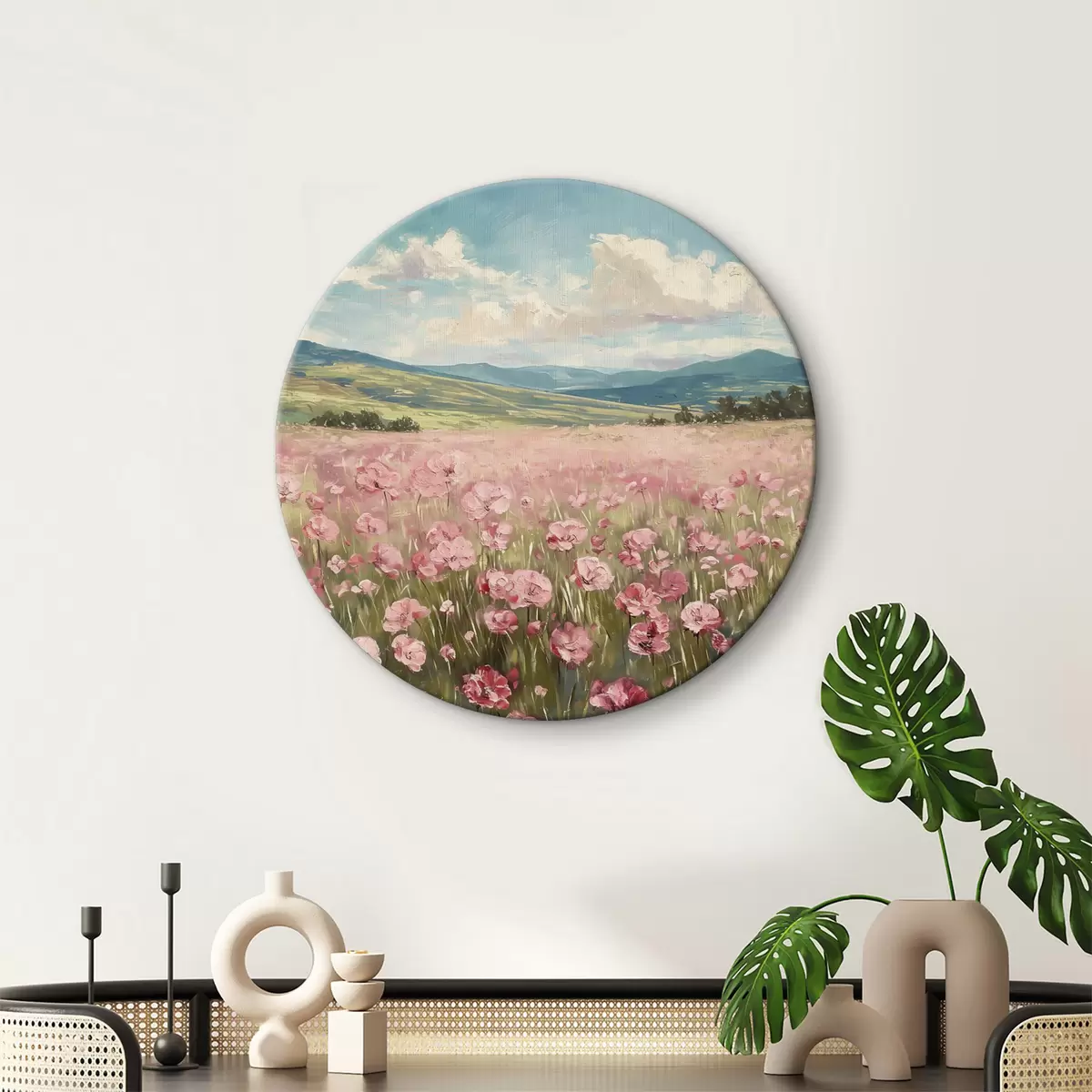 Okrągłe obrazy Łąka z różowymi kwiatami, góry, krajobraz natury, błękitne niebo z chmurami, akryl r40232