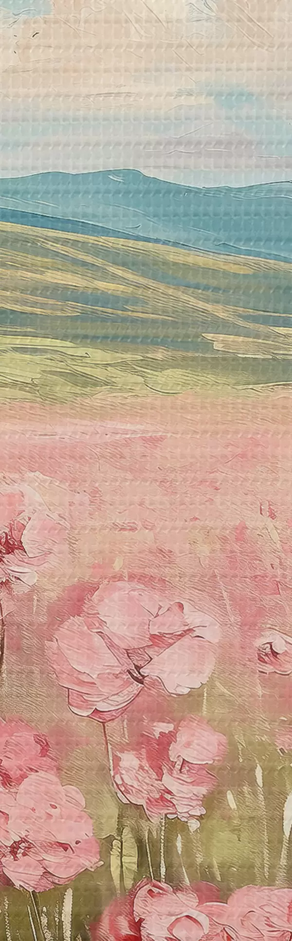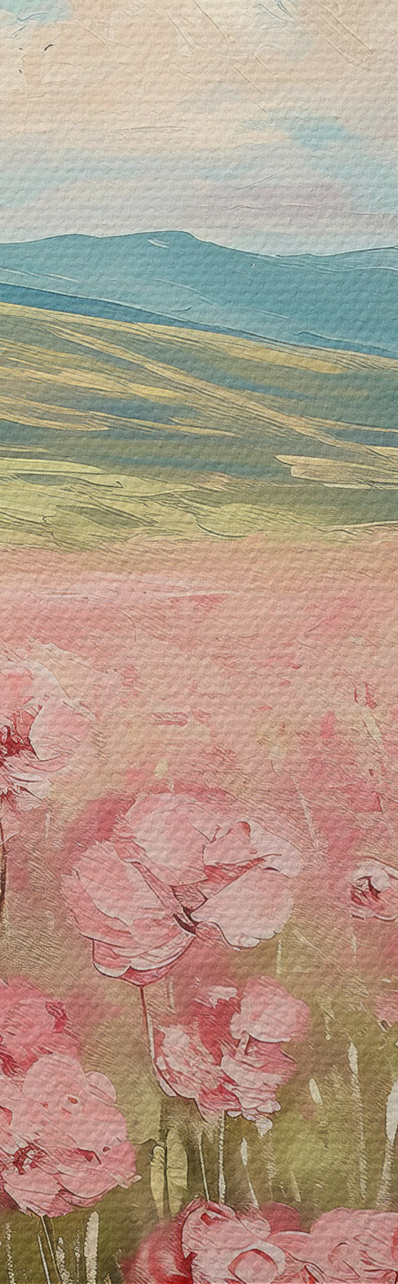 Okrągły obraz Łąka z różowymi kwiatami, góry, krajobraz natury, błękitne niebo z chmurami, akryl Nr r40232